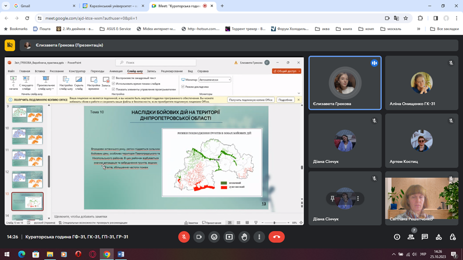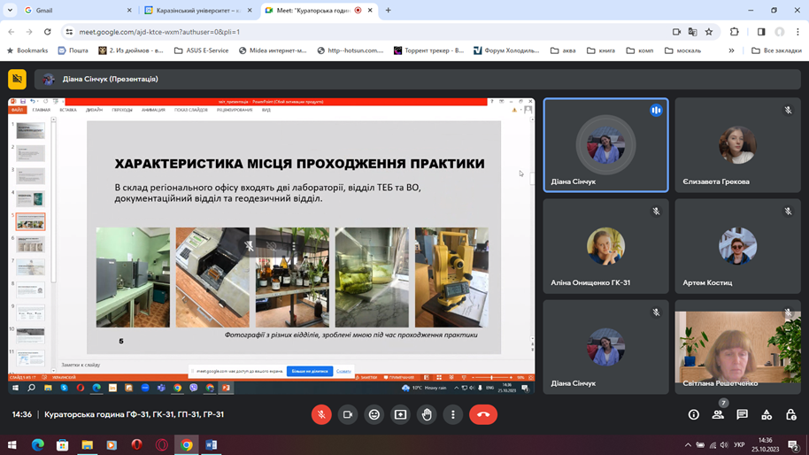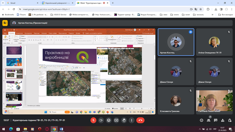 Під час захисту результатів практики на виробництві студенти представили виконанні завдання від підприємства та науково-дослідні: створено карту рельєфу Харківської області традіційними та геоінформаційними способами, проведено інвентаризацію водних обєктів Харківської області (Онищенко А.),
