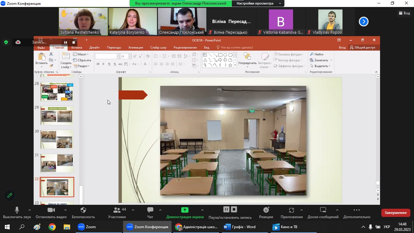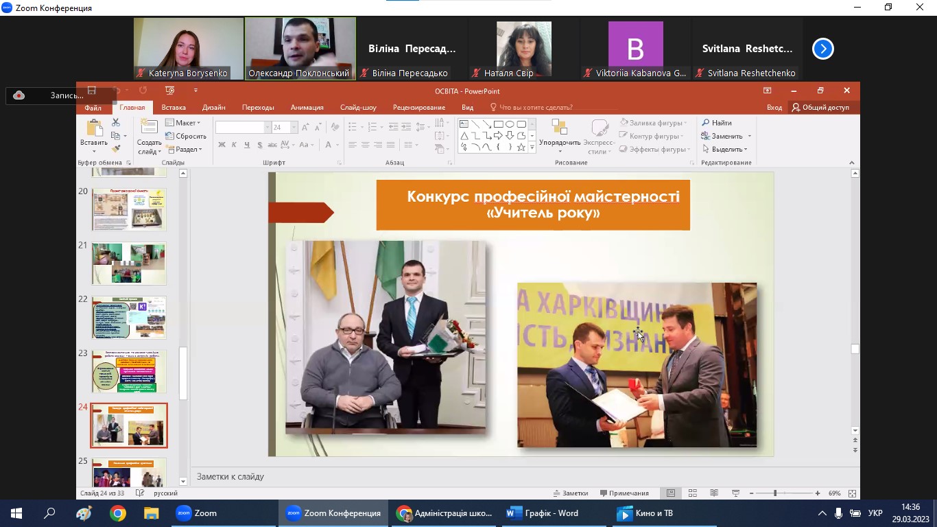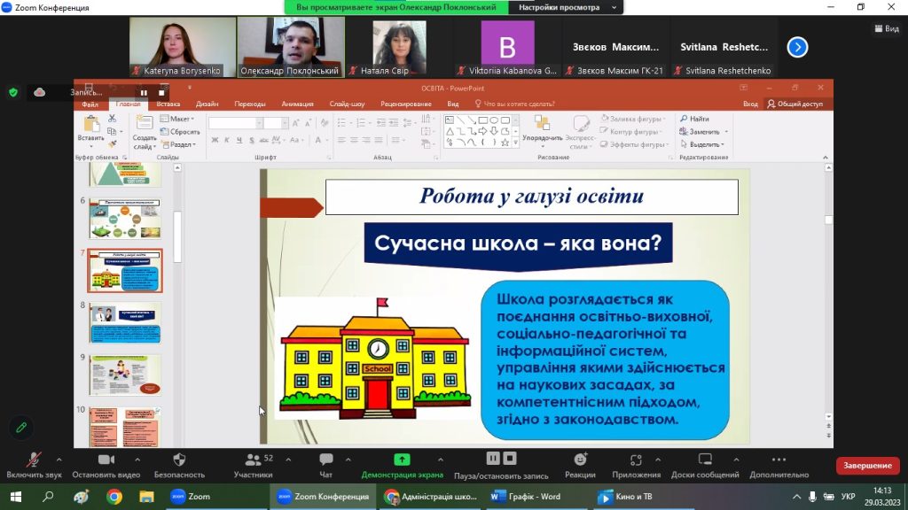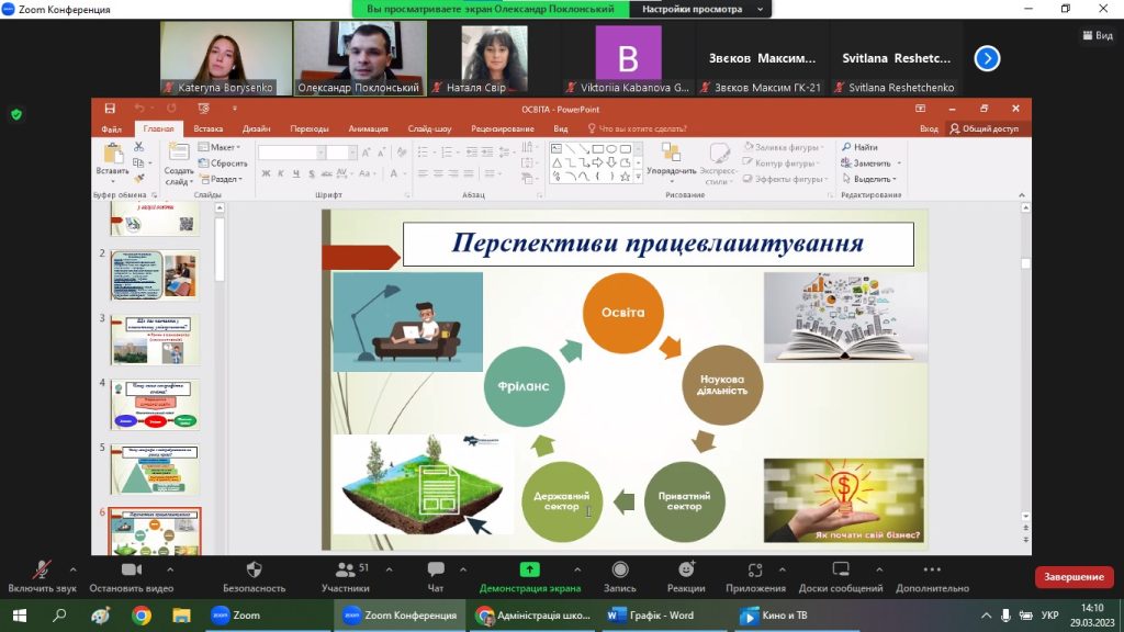 Учасники онлайн майстер-класу дізналися з виступу Олександра Олександровича про таке: як обрати галузь працевлаштування; чому саме класична освіта є важливим етапом і запорукою успіху для майбутньої самореалізації; чому географи є затребуваними на ринку праці; парадигми сучасної освіти та вимоги до сучасного вчителя; переваги та перспективи працевлаштування, робота в галузі освіти та дотичних підприємствах в межах кожної з ОПП; лайфхаки щодо самомотивації та самоаналізу; секрети грамотного підходу до вчительської справи; спогади про навчання на кафедрі О. О. ПОКЛОНСЬКОГО та ще багато цікавих фактів та моментів. Загалом подія відбулася у дружній, натхненній, мотивуючій атмосфері порад, спогадів та поширення досвіду, спікер надзвичайно емоційно та зрозуміло описав ситуацію, яка зараз панує в загальній середній освіті, на прикладі Харківської школи № 38 та продемонстрував світлини і відео її освітнього середовища. До речі, Олександр під час нашого онлайн-заходу вів зустріч зі свого кабінету, бо це безпечно, оскільки школа має зразкове та облаштоване укриття. Директор люб’язно провів слухачам повноцінну віртуальну екскурсію закладом освіти та запросив усіх присутніх організовано відвідати цю чудову школу.