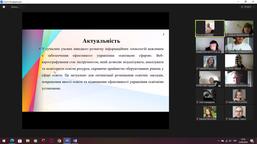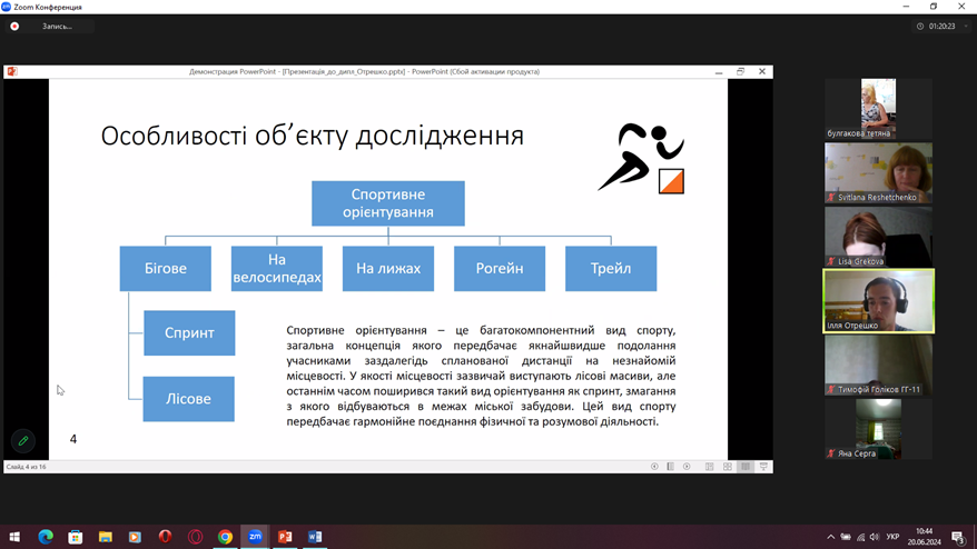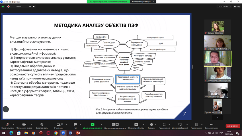 В доповідях було висвітлено обґрунтування актуальності теми дослідження, мету, завдання, об’єкт, предмет дослідження, які методи використані, основні теоретичні положення та їх підтвердження в процесі дослідження, а саме: досвід використання WEB-карт в різних країнах світу та в Україні, вразливість до повеней території Полтавської області, геоінформаційний аналіз природно-заповідного фонду Херсонської області та порушень сільськогосподарських земель, спричинених бойовими діями, картографічні особливості аграрного сектору, водні конфлікти в Україні 2014-2023 рр., розвиток спортивного орієнтування в Україні та світі, вітчизняний досвід формування природничої компетентності в початковій школі, тенденції розвитку внутрішнього туризму в Україні в сучасних реаліях, зарубіжний та вітчизняний досвід використання ГІС та даних ДЗЗ для екологічного моніторингу, водні туристичні маршрути по регіону, туристичні ресурси Одеської області, стан розвитку екстремального туризму та багато інших.