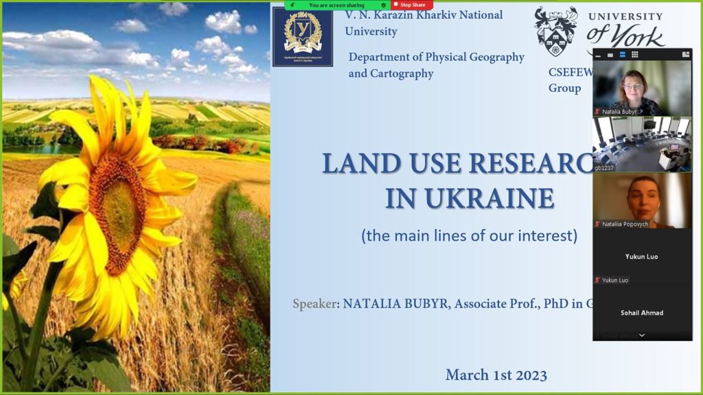 У середу, 1 березня 2023 року на кафедрі фізичної географії та картографії відбувся спільний семінар викладачів кафедри фізичної географії та картографії Каразінського університету та наукової групи «Створення стійких і справедливих продовольчих, енергетичних і водних систем» (CSEFEWS RESEARCH GROUP) кафедри навколишнього середовища та географії Університету Йорку (Велика Британія). Це була перша (ознайомча) зустріч, де сторони ознайомилися з основними напрямами роботи задля налагодження співпраці.