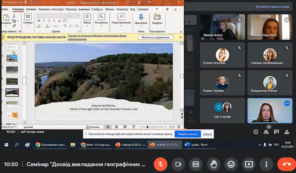 З доповідями виступили доц. Попович Н.В., яка розповіла про загальні засади організації співпраці з Ханчжоуським педагогічним університетом, особливості організації навчального процесу у першому семестрі 2022-2023 н.р. та плани щодо викладання географічних дисциплін у другому семестрі 2022-2023 н.р.