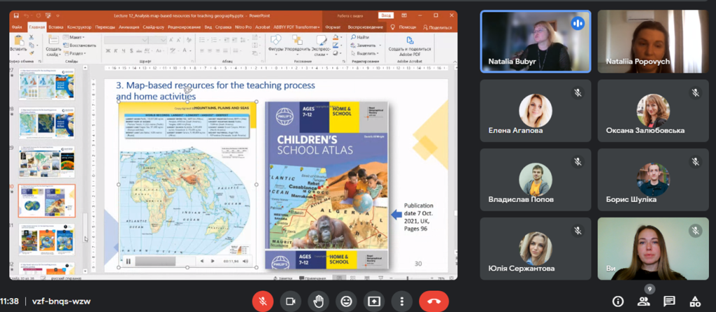 Доц. Бубир Н.О. розповіла про досвід викладання дисципліни «Geography Teaching Theory» акцентуючи увагу на переліку навчальних матеріалів, що надсилалися напередодні занять – перелік термінів та визначень, що розглядатимуться на лекції, інструкції до проведення практичних занять, приклади виконання практичних робіт тощо.