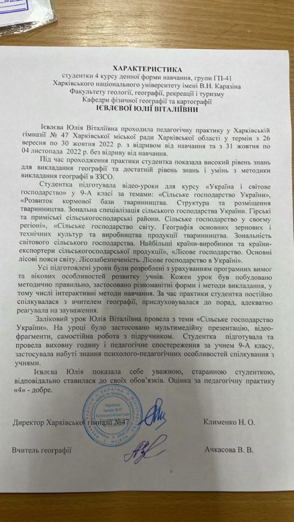 Назаренко Юлія Михайлівна, студентки 4 курсу денної форми навчання, групи ГК-41, проходила виробничу (педагогічну) практику області у термін з 26 вересня по 21 жовтня 2022 н.р. Говоруха Аліна Едуардівна та Ієвлєва Юлія Віталіївна, студентки групи ГП-41 проходили педагогічну практику у Харківській гімназії №47 Харківської міської ради Харківської області, у термін з 26 вересня по 30 жовтня 2022 р. з відривом від навчання та з 31 жовтня по 04 листопада 2022 р. без відриву від навчання.