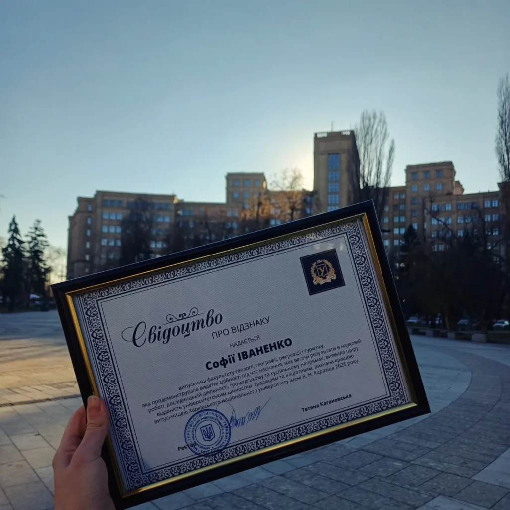 24 грудня 2025 року у Північному корпусі ХНУ імені В. Н. Каразіна відбулася урочиста церемонія вручення дипломів магістрам зимового випуску. Цей день став особливим для нашої кафедри, адже випускниця освітньо-професійної програми «Географія» Софія Іваненко була удостоєна високого звання «Кращий випускник Каразінського університету»!