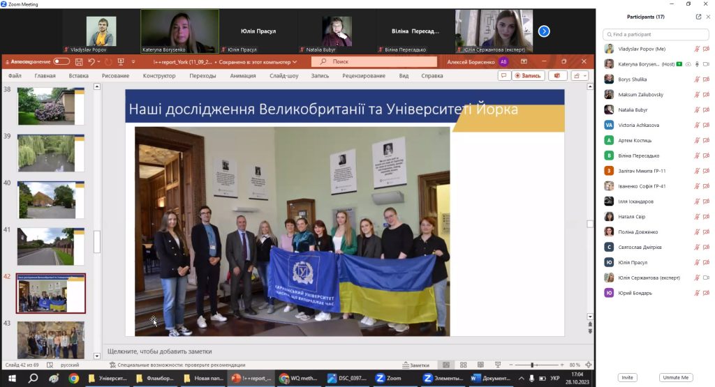 28 жовтня 2023 року на кафедрі фізичної географії та картографії у форматі онлайн відбувся методичний семінар на тему «Досвід наукового стажування у Великій Британії». Доповідачі семінару: к. пед. н., доцент БОРИСЕНКО Катерина Борисівна та аспірант кафедри СЕРЖАНТОВА Юлія Юріївна. Під час заходу було розглянуто основні напрямки роботи спікерів під час літнього стажування в Університеті Йорка та результати їхніх індивідуальних наукових проєктів.