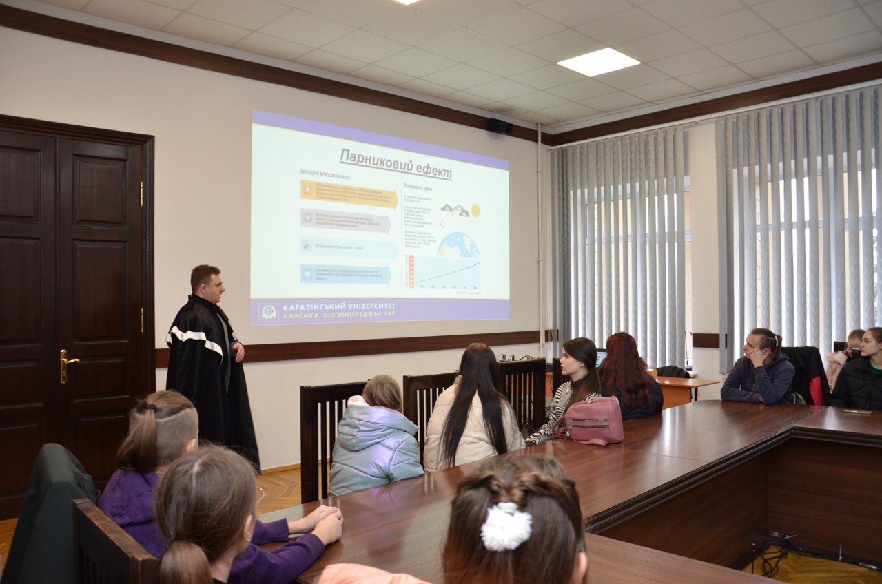 У суботу, 2 грудня, у рамках проєкту Karazin Weekend, старший викладач кафедри фізичної географії та картографії Дмітрієв Святослав провів профорієнтаційну лекцію на тему “Зміни клімату: напрямки, причини, наслідки та сучасні рішення проблем” для учнів шкіл міста Харкова та Харківської області. Учні змогли відчути себе справжніми студентами і ознайомитися із можливостями щодо вступу на спеціальності рівня Бакалавр на факультеті геології, географії, рекреації і туризму, а також із діяльностю кафедри фізичної географії та картографії у галузі вивчення та адаптації до змін клімату. У рамках лекції була проведена дискусія серед учнів стосовно їх бачення вектору кліматичних змін та можливих засобів уникнення їх негативних наслідків.
