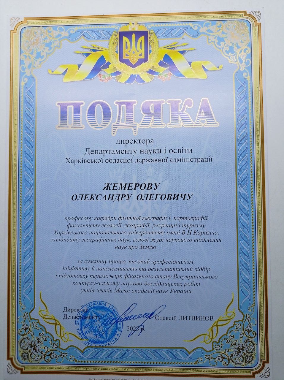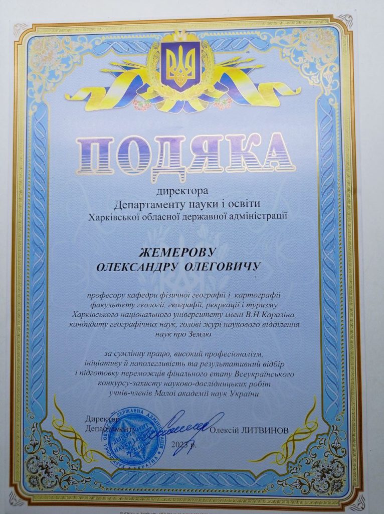 На Вченій раді університету викладачів кафедри фізичної географії та картографії канд. геогр.наук, професора ЖЕМЕРОВА Олександра Олеговича та канд.геогр.наук, доцента РЕШЕТЧЕНКО Світлану Іванівну було нагороджено ПОДЯКОЮ Департаменту науки і освіти Харківської обласної державної адміністрації за багаторічну сумлінну працю, високий професіоналізм, результативний відбір та підготовку переможців фінального етапу Всеукраїнського конкурсу-захисту науково-дослідницьких робіт учнів-членів Малої академії наук України. Щиро вітаємо колег та бажаємо їм нових творчих здобутків.