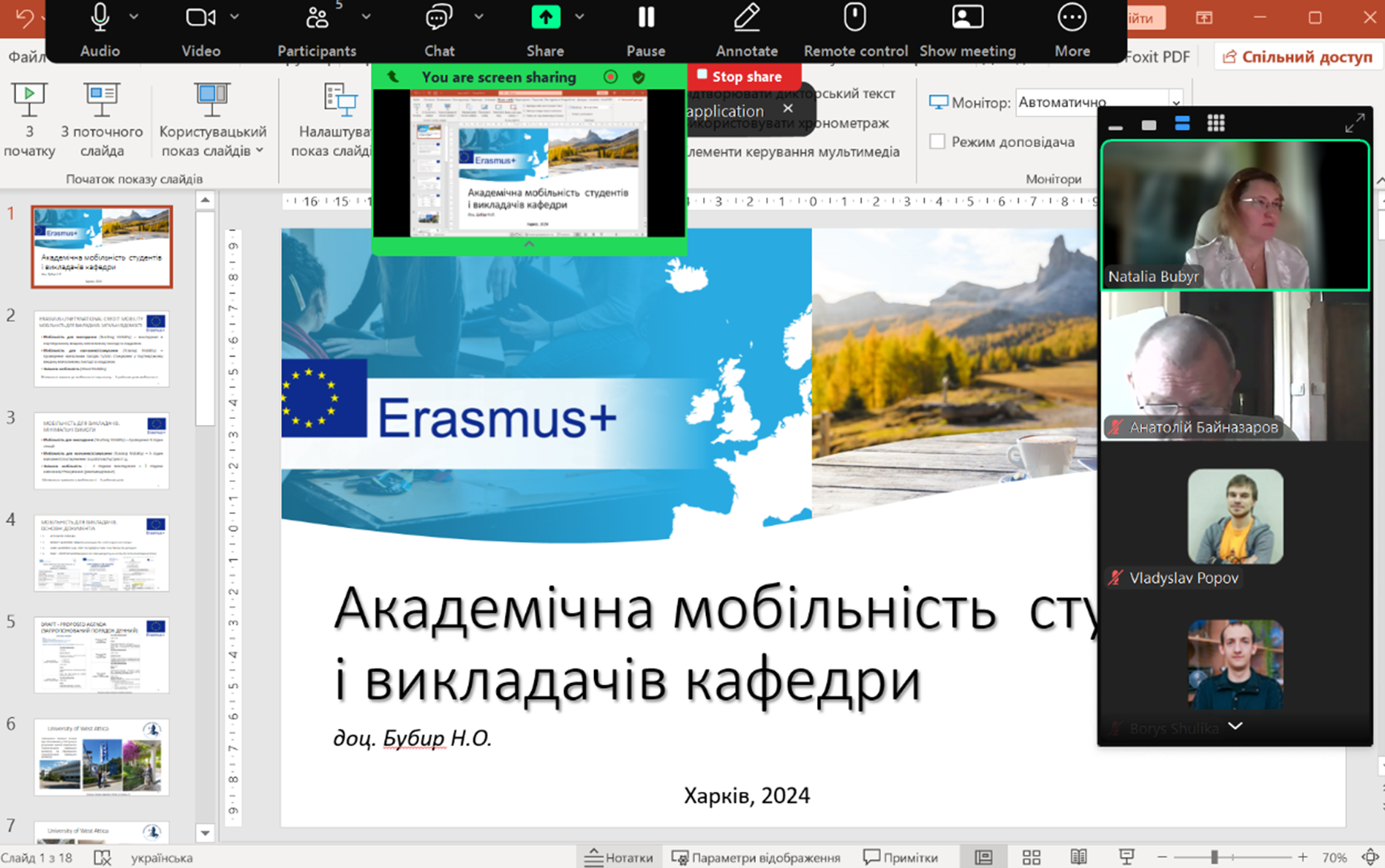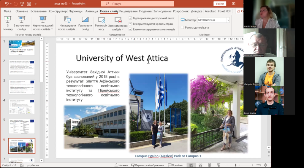 З доповіддю виступила доц. Бубир Н.О., яка розповіла про загальні засади організації академічної мобільності викладачів за програмою Еrasmus+, особливості організації академічної мобільності для викладання та поділилася власним досвідом академічної мобільності для викладання в університеті Західної Аттики (Афіни, Греція) у травні 2024 р.