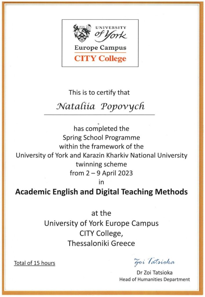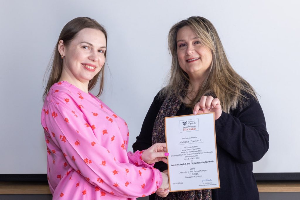У період з 3 по 8 квітня 2023 р. доцент кафедри фізичної географії та картографії Наталія ПОПОВИЧ взяла участь у Весінній школі на базі Європейського кампусу CITY College Університету Йорка в м. Салоніки (Греція).