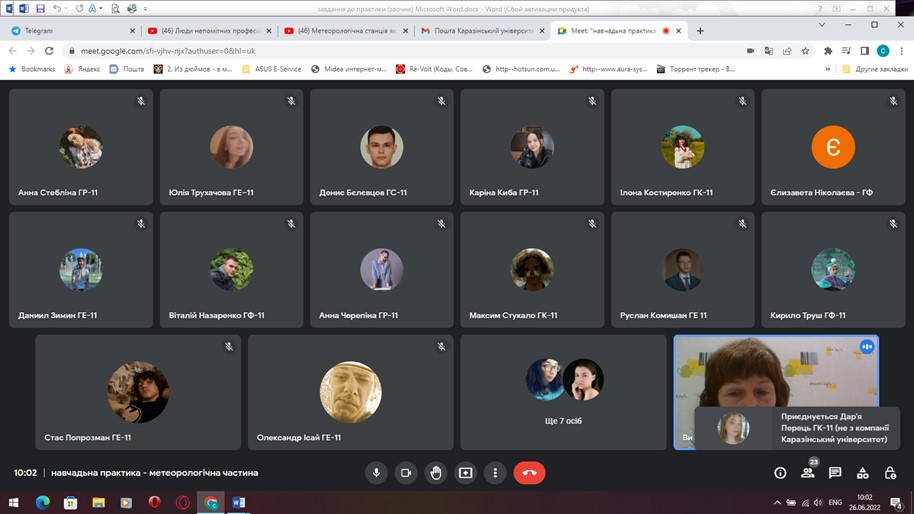 Заняття проводилися за допомогою платформи Google Meet, виконані студентами матеріали оформлювалися у робочий зошит з навчальної природничо-наукової практики з дисципліни «Метеорологія і кліматологія», що зберігаються на гугл-диску. Підсумкова робота виконувалася в форматі Google-форми.