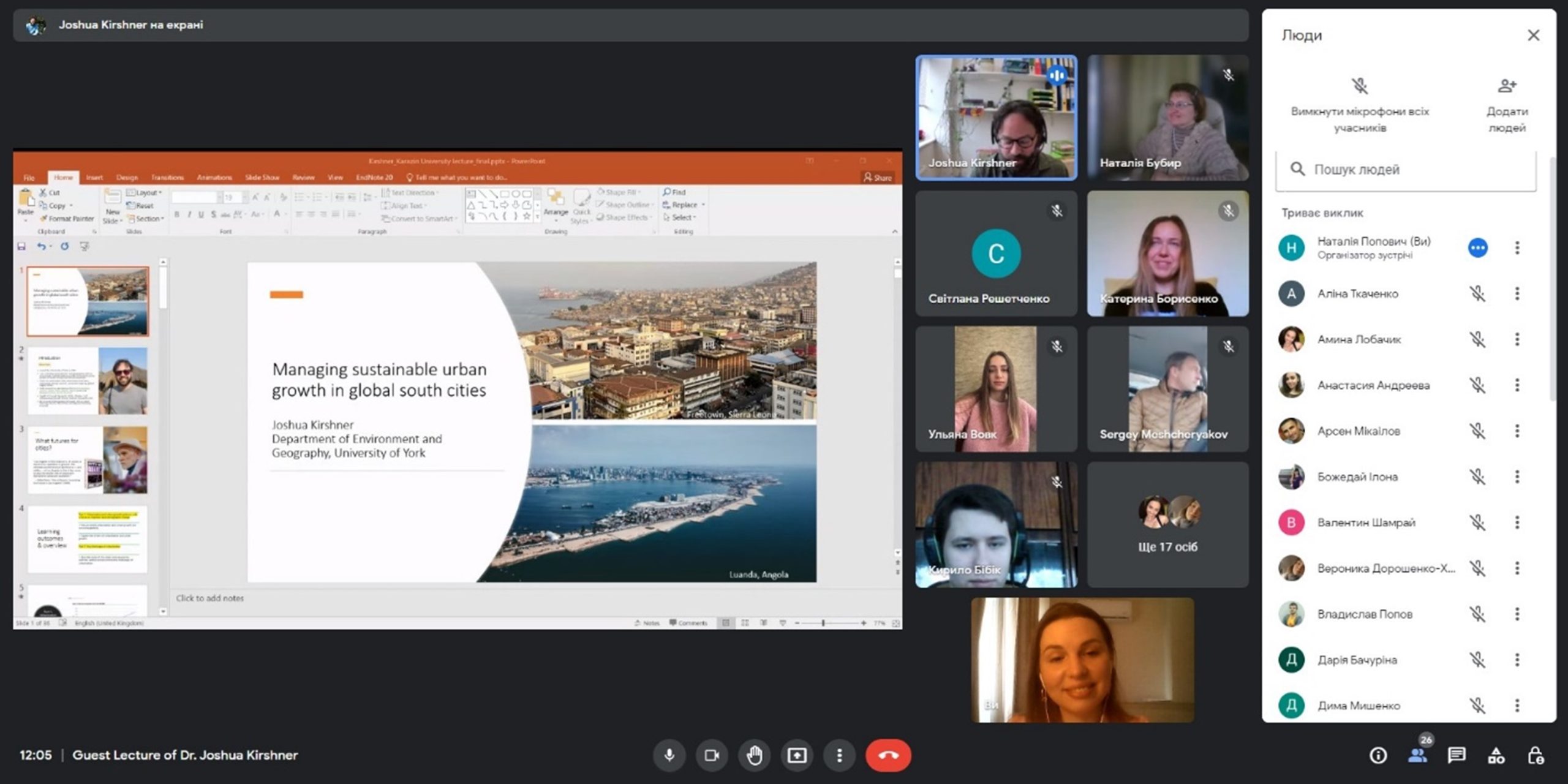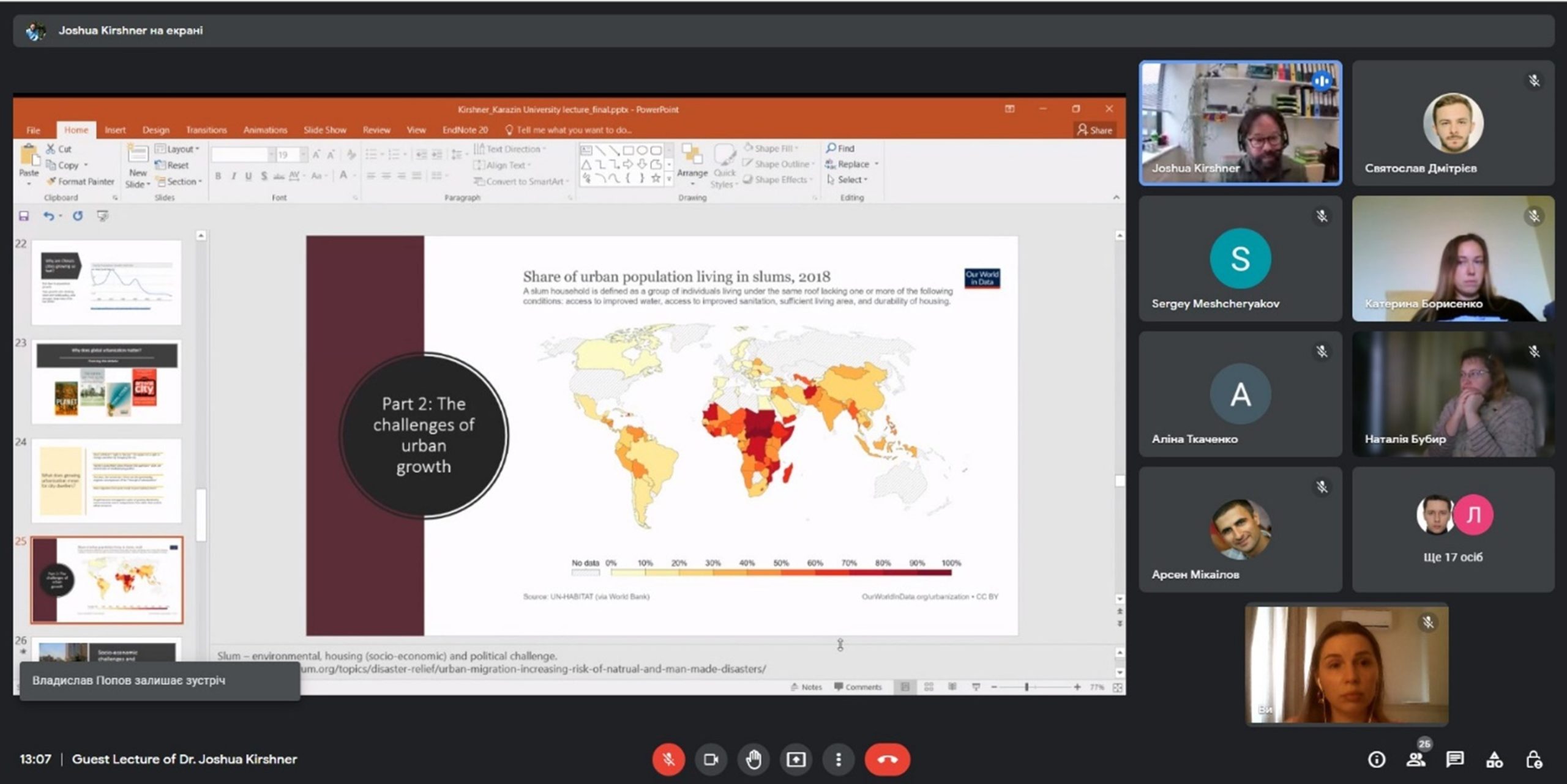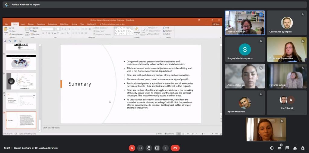 Dr Joshua Kirshner має широке коло професійних інтересів, значний досвід досліджень в Африці та Латинській Америці, зокрема в Мозамбіку, Південній Африці, Бразилії та Болівії. У його лекції на тему «Global Urbanism: Managing Urban Growth in Global South Cities» були розглянуті сучасні тенденції та виклики, з якими стикаються регіони світу через зростання кількості населення, урбанізаційні та міграційні процеси.