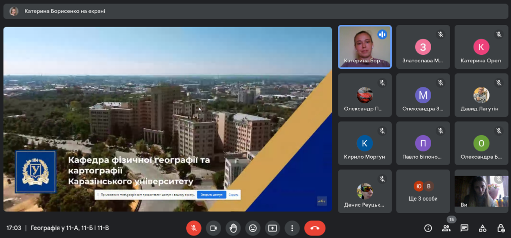 Організатори надали інформацію про специфіку навчання у Каразінському університеті та звичайно ж детально проінформували ліцеїстів про активності кафедри фізичної географі та картографії, як у стандартному так і у дистанційному форматах.