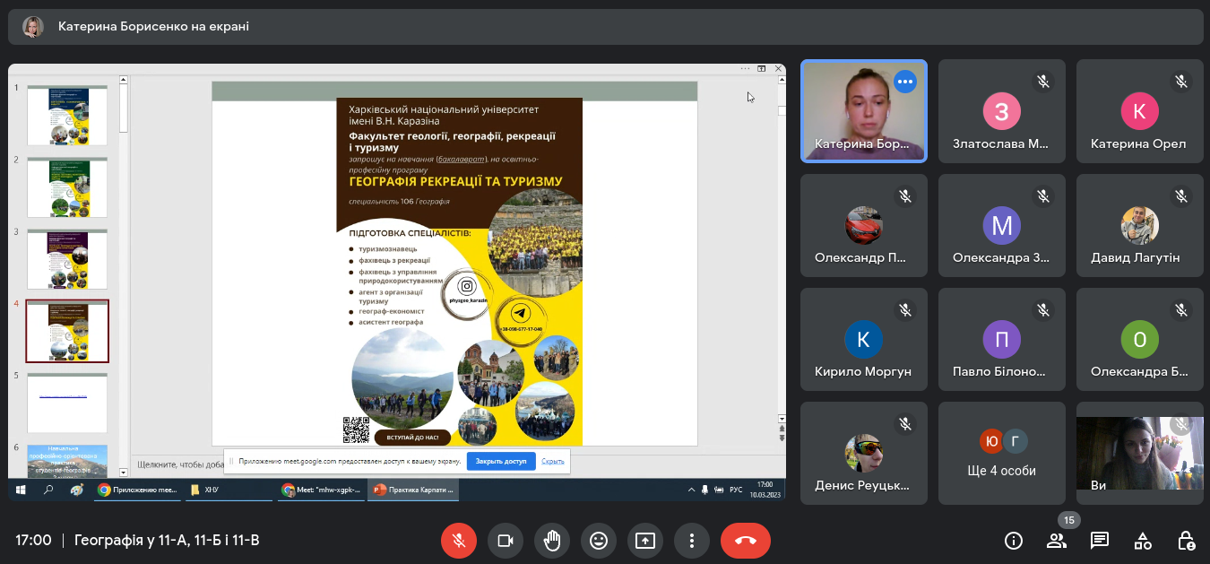 Організатори надали інформацію про специфіку навчання у Каразінському університеті та звичайно ж детально проінформували ліцеїстів про активності кафедри фізичної географі та картографії, як у стандартному так і у дистанційному форматах.