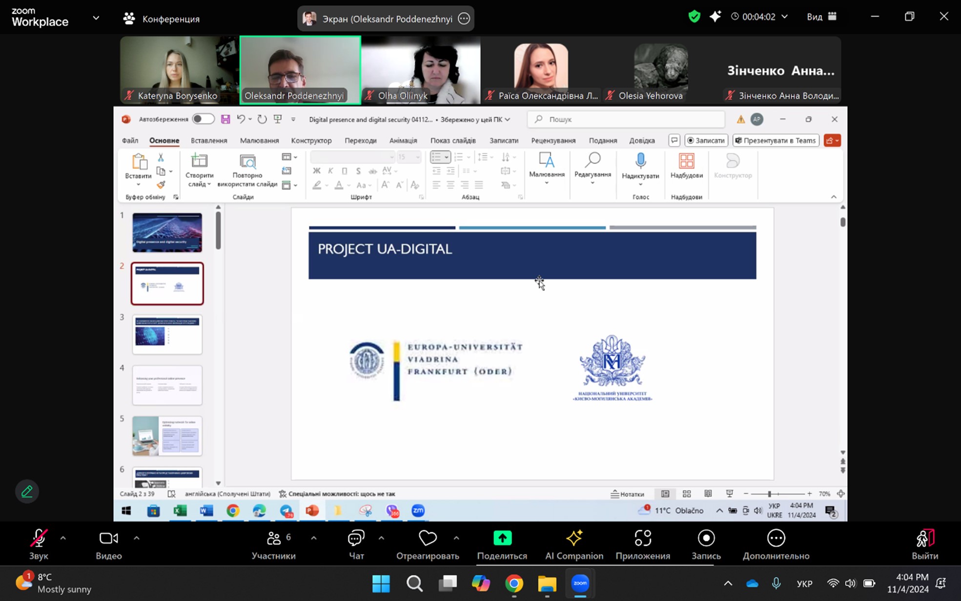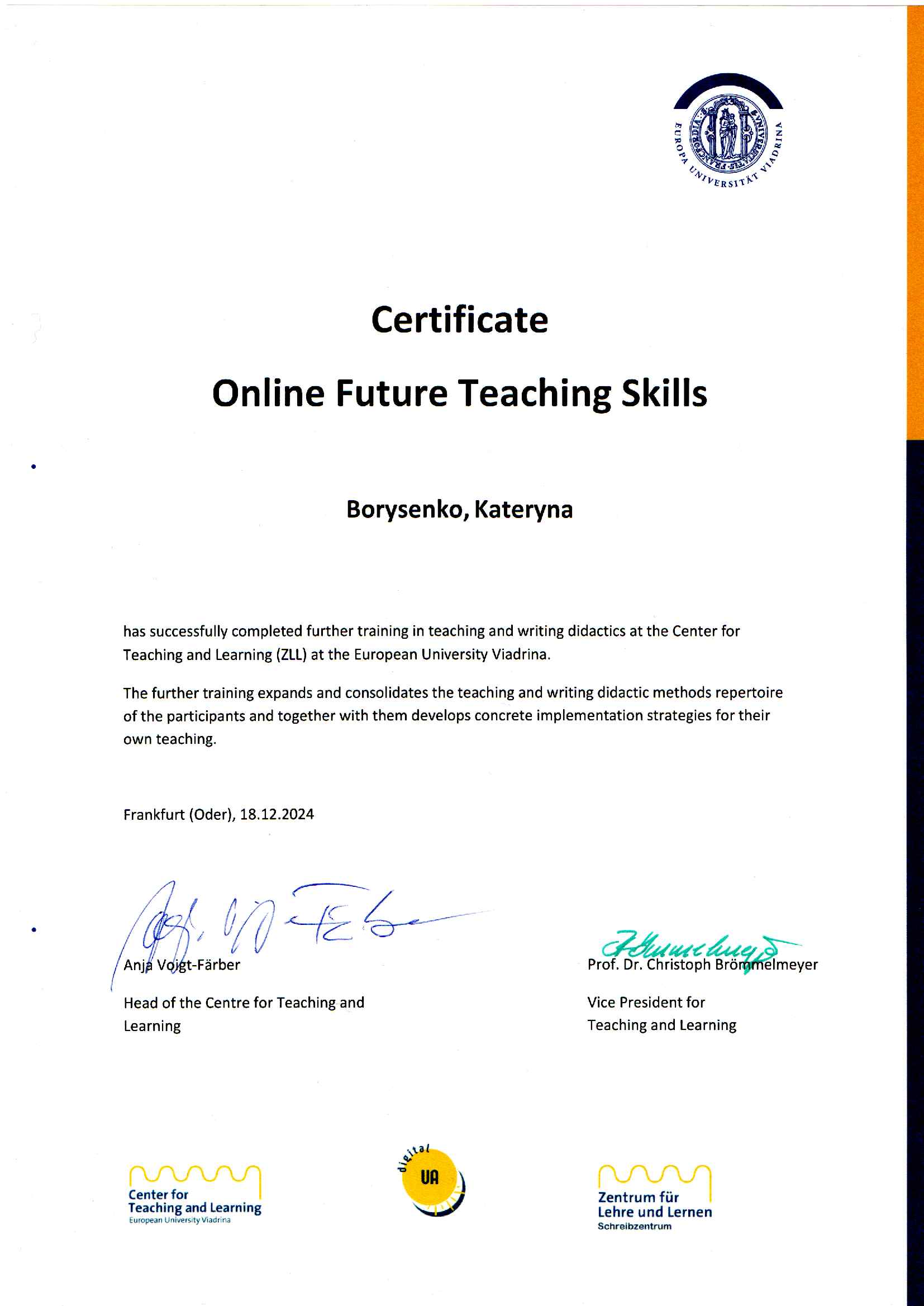 Доцент кафедри фізичної географії та картографії к.пед.н. Катерина БОРИСЕНКО успішно пройшла онлайн-стажування англійською мовою в Університеті Віадріна (м. Франкфурт-на-Одері, Німеччина) за темою “Online Future Teaching Skills”. Програма стажування тривала з 28 жовтня по 5 листопада 2024 року та була спрямована на розвиток дидактичних і цифрових навичок у вищій освіті.