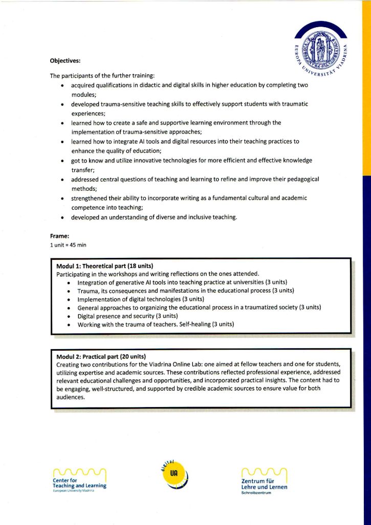Модуль 2: Практична частина (20 академічних годин). У межах цього модуля учасниця створила два науково-методичних матеріали для Viadrina Online Lab: один – для викладачів, інший – для студентів. Робота базувалася на професійному досвіді, містили актуальні освітні виклики та можливості, а також інтегрували практичні підходи, підкріплені науковими джерелами.