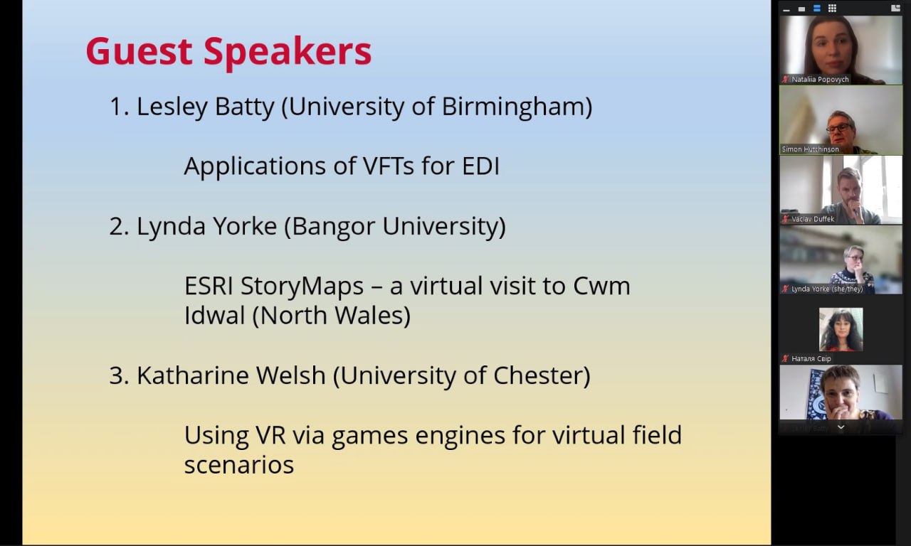 Також до майстер-класу в якості слухача доєднався Dr Václav Duffek, представник Університету Західної Богемії (Чехія). У доповідях експертів були розкриті практичні аспекти створення віртуальних екскурсій на платформах ThingLink і ArcGIS StoryMaps, а також розглянуто, як можна використовувати віртуальну реальність для підготовки студентів до польових практик. Усі учасники заходу отримали надзвичайне задоволення та натхнення для подальшого розвитку своїх фахових здібностей!
