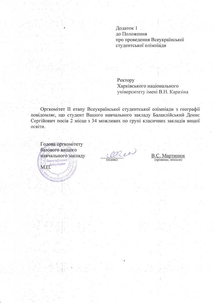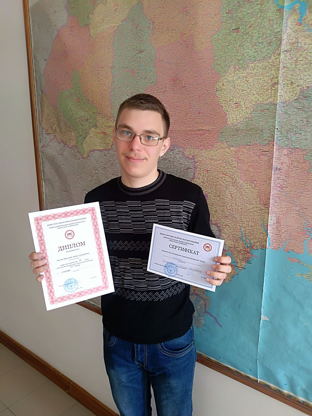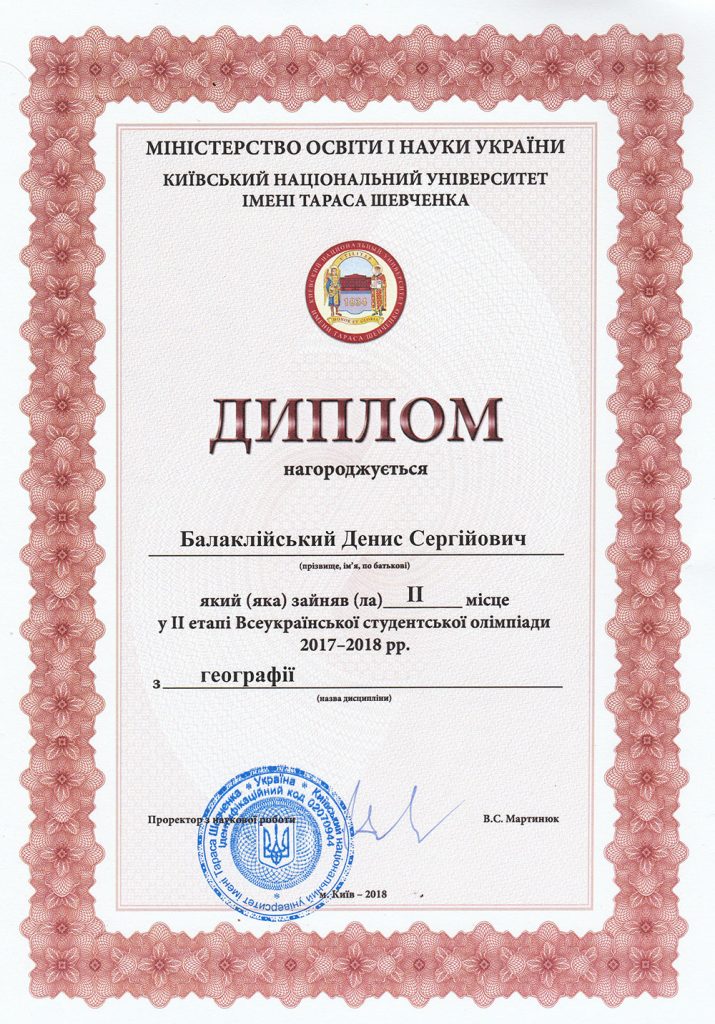 Вітаємо студента групи ГГ-31 Дениса Балаклійського із 2-м місцем (із 34-х можливих) по групі класичних закладів вищої освіти II етапу Всеукраїнської студентської олімпіади. Щиро бажаємо Денису майбутніх звершень на науковій та життєвій ниві!