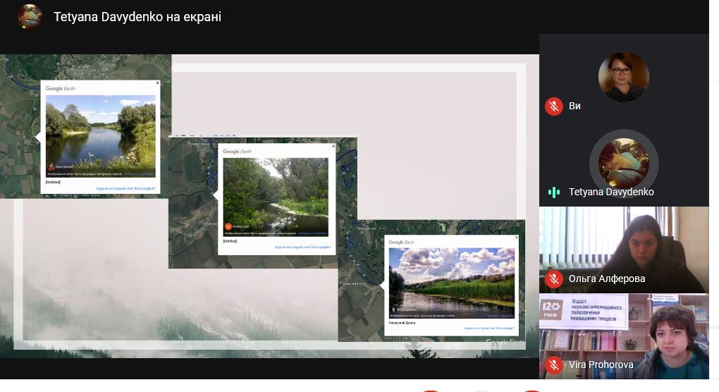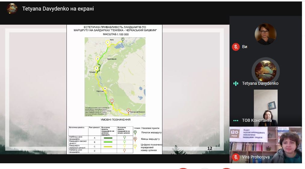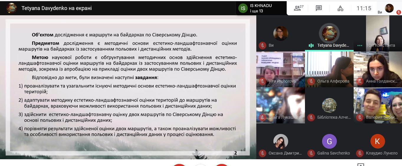 Під керівництвом доцента кафедри Олени СІННОЇ, Тетяною було підготовлено та подано до участі в конкурсі наукову роботу «Естетико-ландшафтознавча оцінка маршрутів на байдарках по Сіверському Дінцю». 27 квітня 2021 р. О. Сінна та Т. Давиденко в режимі онлайн взяли участь у круглому столі «Молодь. Інновації. Майбутнє», що був присвячений Міжнародному дню інтелектуальної власності. Під час круглого столу відбулося обговорення результатів інноваційної діяльності в Харківському регіоні, представлення розробок та нагородження переможців Конкурсу. Робота Тетяни Давиденко викликала жвавий інтерес в організаторів та учасників Конкурсу і нагороджена Дипломом І ступеню у номінації «Краща інноваційна пропозиція».
