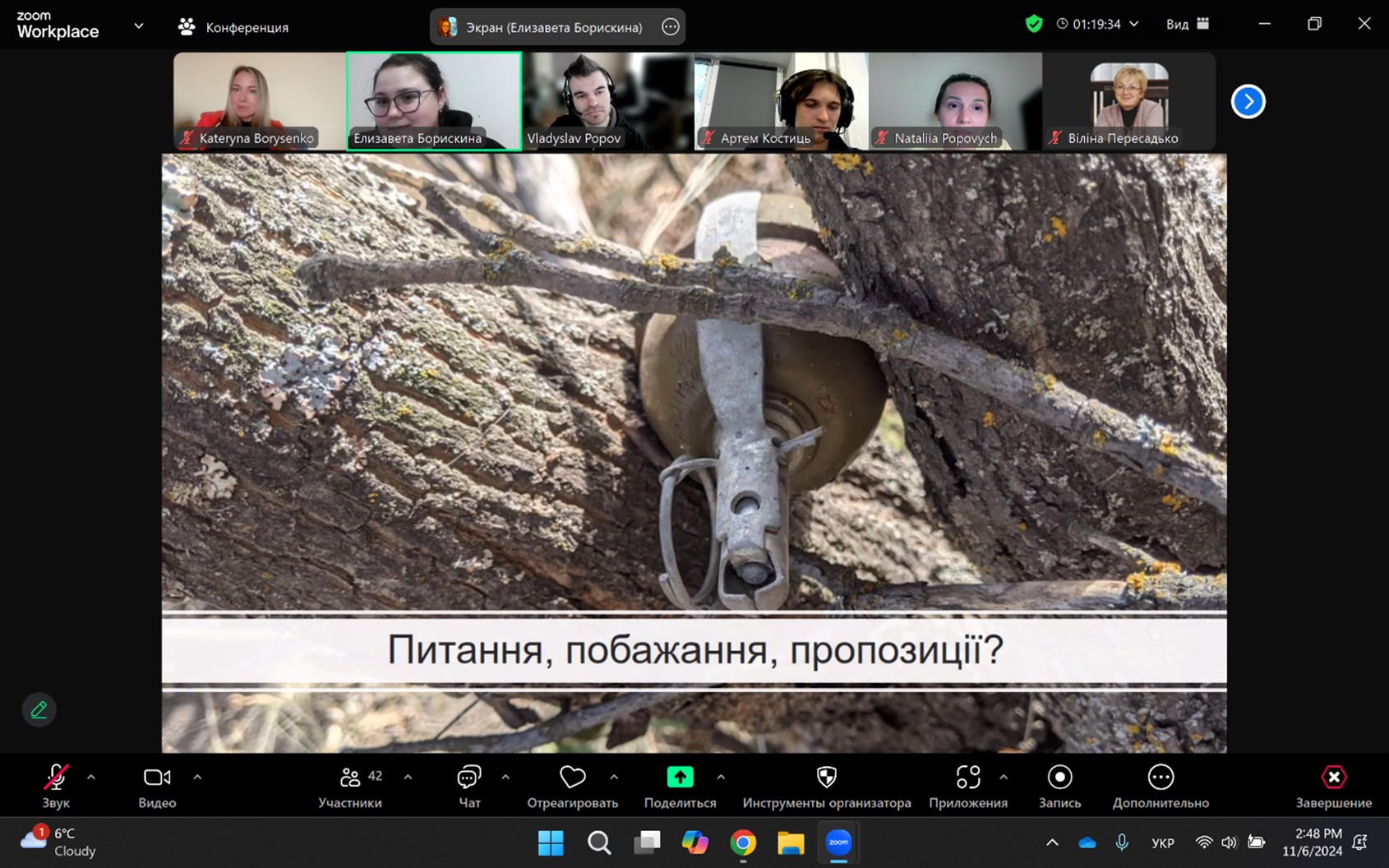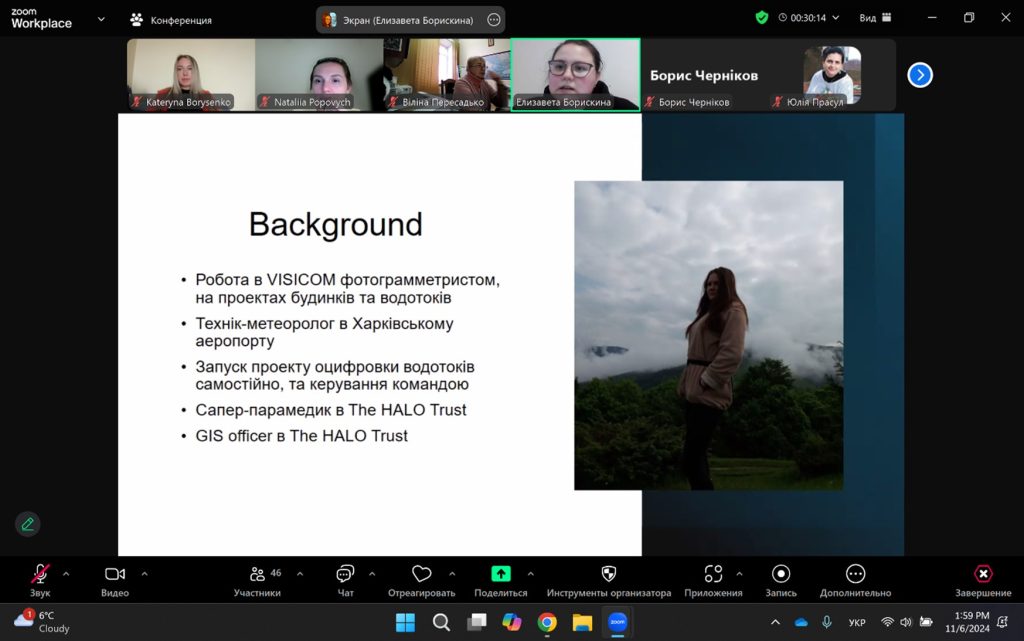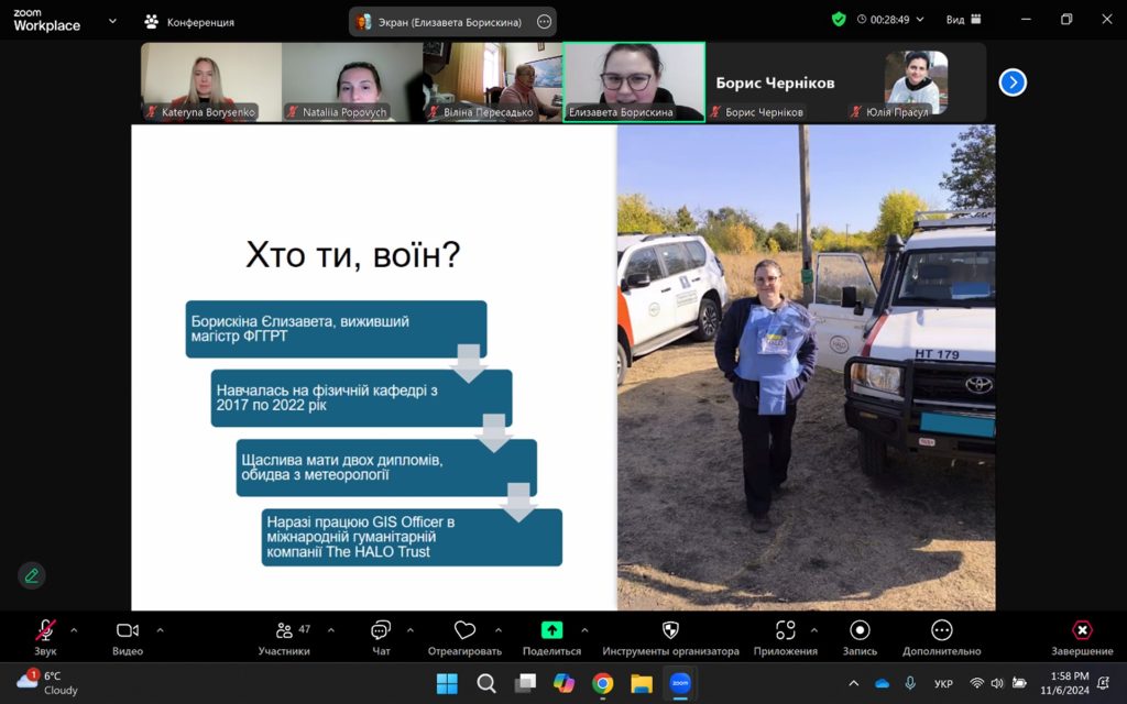 У середу, 6 листопада 2024 р., на кафедрі фізичної географії та картографії на загальній кураторській годині відбулася зустріч з випускницею кафедри 2022 року Єлизаветою БОРИСКІНОЮ. Єлизавета працює за фахом і наразі обіймає посаду GIS officer в компанії гуманітарного розмінування The HALO Trust (м. Київ).
