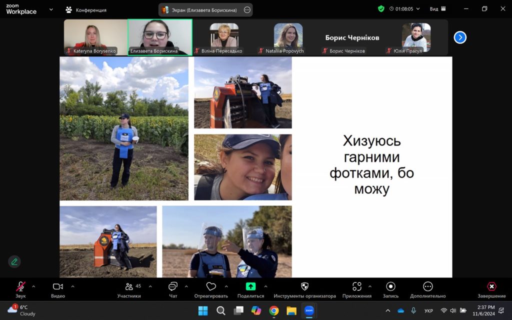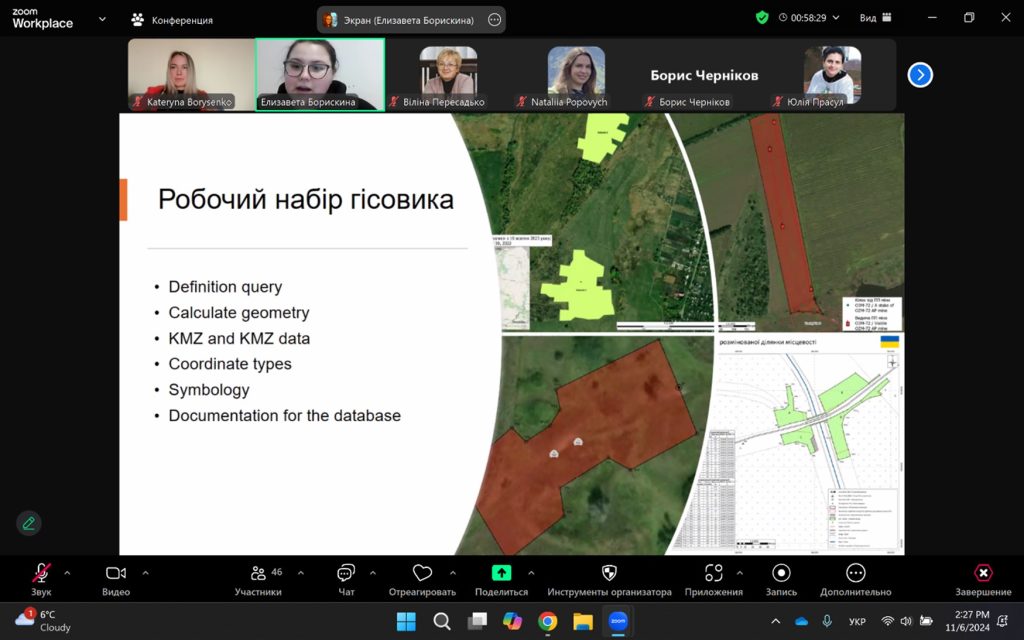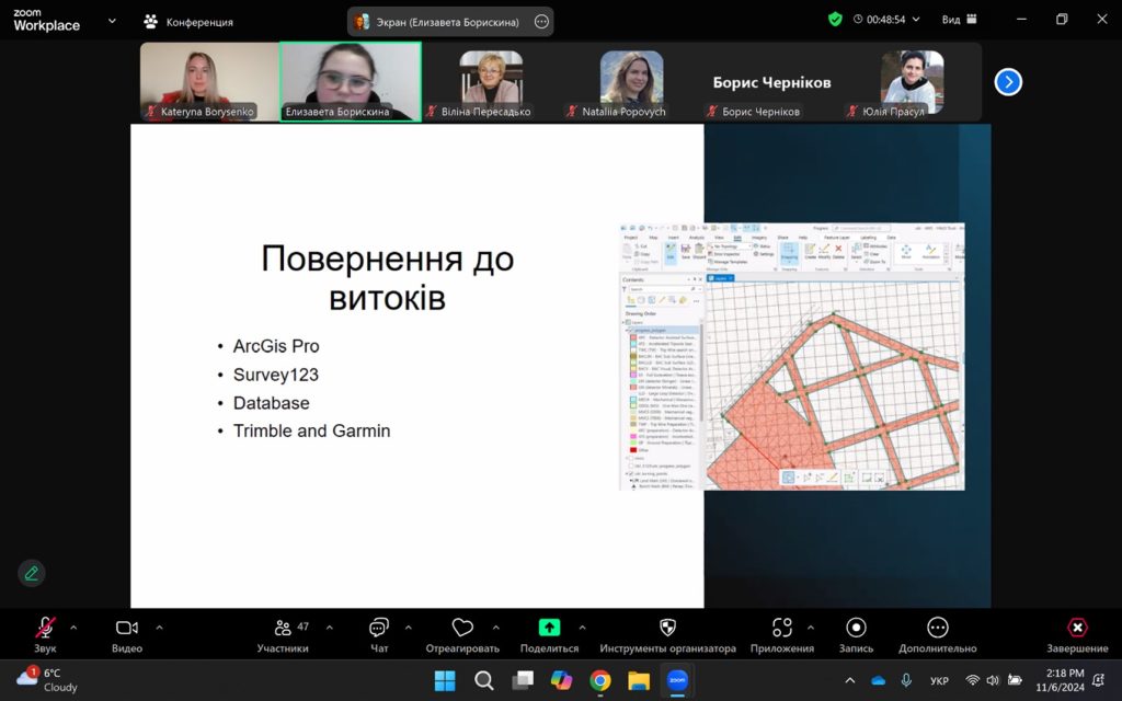 Єлизавета детально розповіла про те, як влаштована система збору та обробки просторової інформації у фірмі, в якій вона працює, ознайомила з функціоналом та процесами розробки відповідних ілюстрацій для агрокомплексу, поділилася особистим досвідом створення і наповнення резюме, надала корисні рекомендації щодо проходження співбесіди. Також у її доповіді для студентів та випускників пролунали цінні поради щодо того, які конкретно практичні кроки необхідно зробити, щоб вдало працевлаштуватися і отримати роботу мрії. Наразі в професійні обов’язки Єлизавети складаються зі створення картографічних матеріалів з використанням геоінформаційних систем, підтримці ведення баз геоданих, підтримку в роботи з навігаційним обладнанням Trimble та підтримка документаційної складової.
