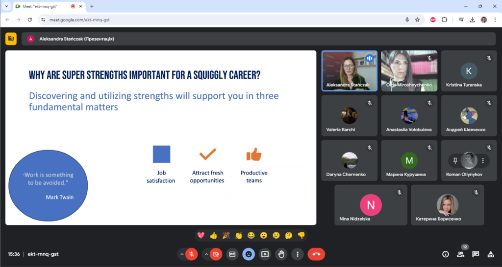 Інтерактивний семінар, був проведений для того, щоб допомогти відкрити та розвинути повний професійний потенціал. Протягом трьох інтенсивних годин учасники, серед іншого, вивчали практичні інструменти для ефективного працевлаштування та вдосконалювали навички самопрезентації, необхідні також в процесі пошуку грантів та іншого кар’єрного зростання.