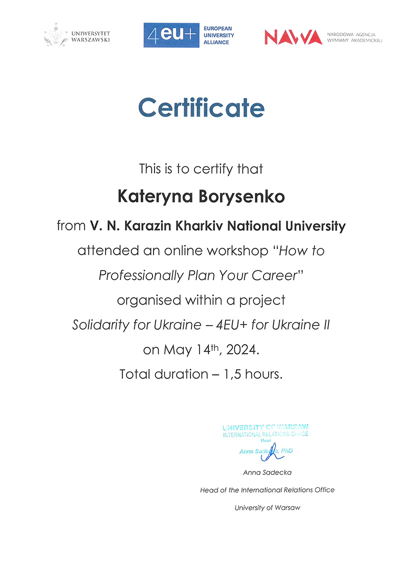 Доцент кафедри к. пед. н. Катерина БОРИСЕНКО взяла участь в онлайн вебінарі “How to Professionally Plan Your Career?”, організованого іноземними партнерами Каразінського університету з Варшавського університету в межах проєкту «Solidarity with Ukraine – 4EU+ for Ukraine II» за підтримки Польського національного агентства з питань академічного обміну (NAWA), який відбувся 14 травня2024 року.