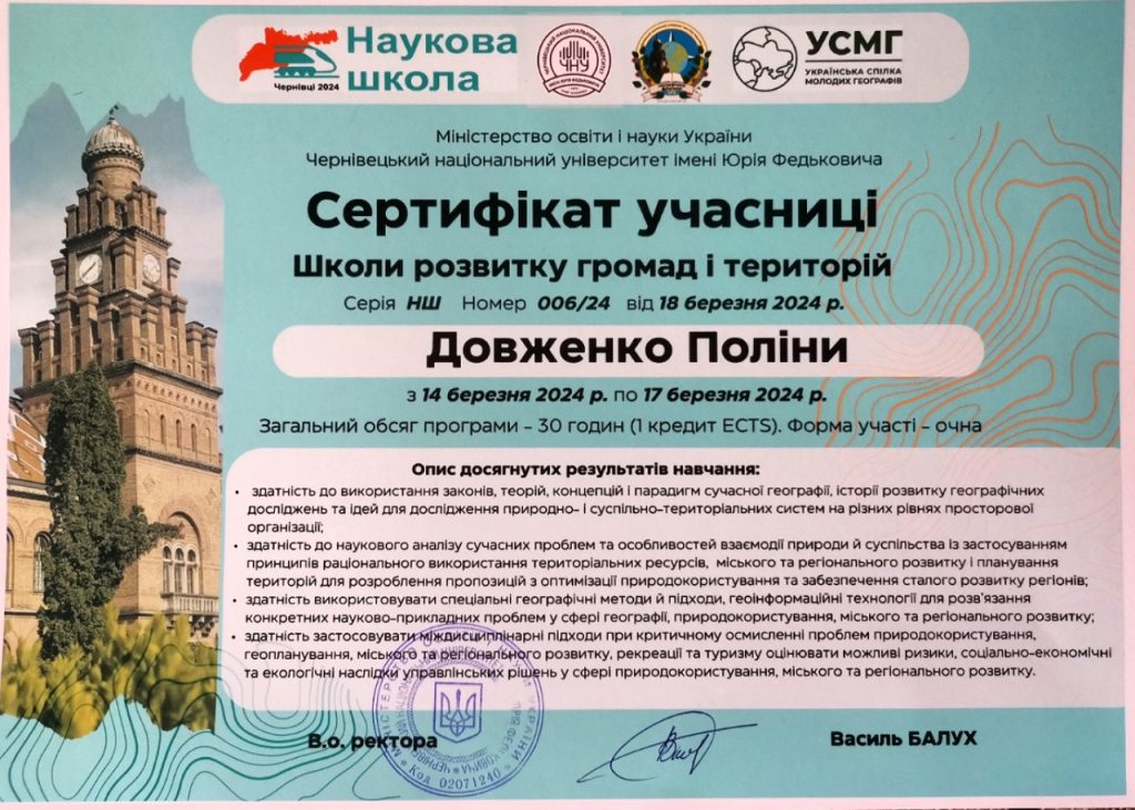 Із 14 по 17 березня студентка 1 курсу магістратури ОПП «Картографія, геоінформаційні системи і дистанційне зондування Землі» кафедри фізичної географії та картографії, Поліна Довженко, взяла участь у Школі розвитку громад і територій, організованій Українською спілкою молодих географів спільно з географічним факультетом Чернівецького національного університету імені Юрія Федьковича. Загалом учасниками заходу стали 30 представників осередків спілки із Харкова, Львова, Києва, Тернополя, Луцька, Ужгорода і Чернівців.