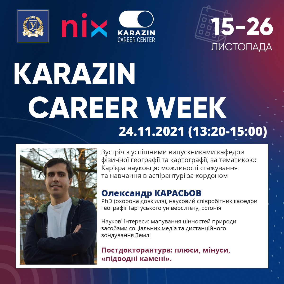 Під час заходу плануються виступи випускників кафедри, які нині є фахівцями у галузі фізичної географії, охорони довкілля та мають досвід навчання в аспірантурі за кордоном: