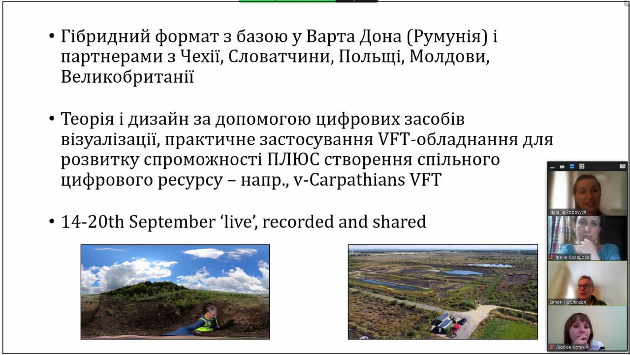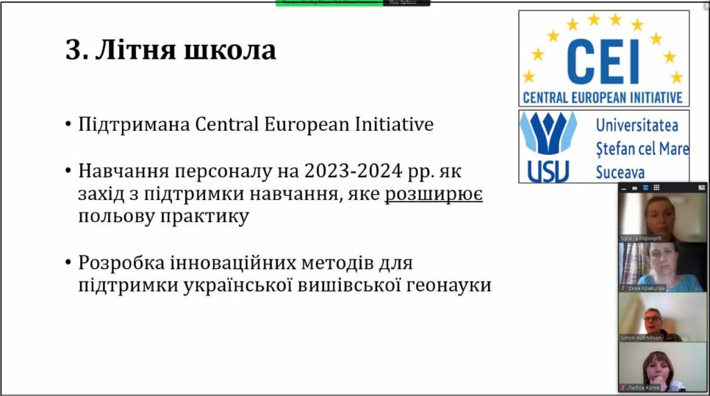Важливим пунктом доповіді стала інформація про Літню школу в Румунських Карпатах, підтриману програмою Регіонального міжурядового форуму «Центральноєвропейська ініціатива». Школа буде проведена у гібридному форматі 14-20 вересня 2023 р., її метою є підтримка української географічної науки шляхом навчання викладачів ЗВО створенню віртуальних екскурсій, починаючи зі збору польових даних і закінчуючи оформленням екскурсії на платформі ThingLink.