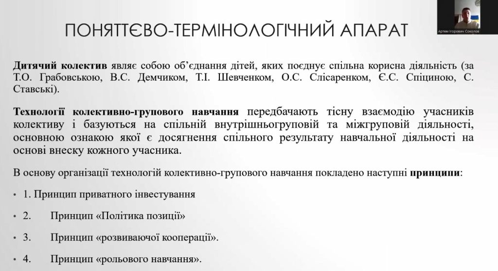 Набутий педагогічний досвід дозволив Артему СОКОЛОВУ реалізувати й захистити результати дослідження «Використання технологій колективно-групового навчання при викладанні курсу географії у 8 класах закладів загальної середньої освіти». Науковий керівник – доцент, к.г.н. Наталя БУБИР.