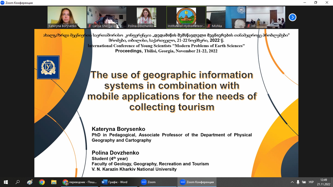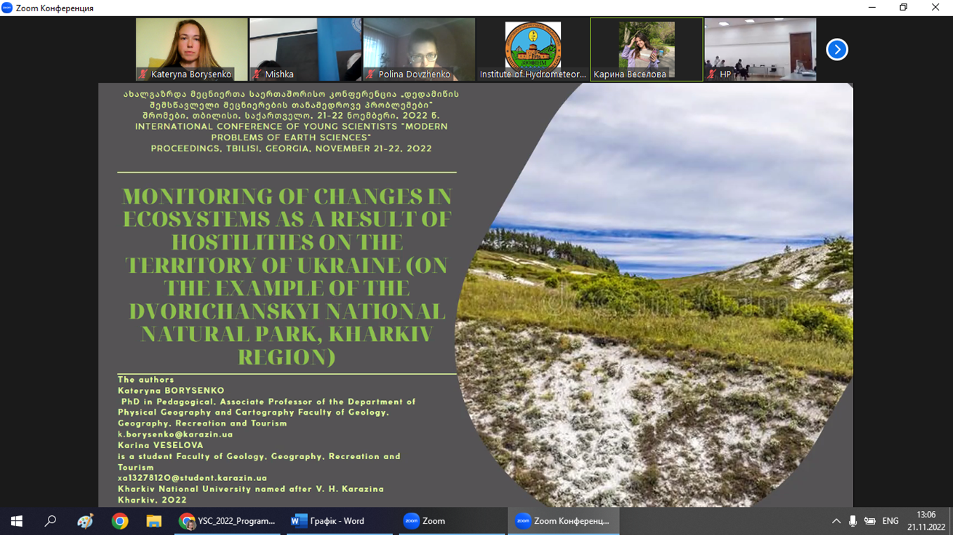 У роботі конференції взяли участь доцент кафедри фізичної географії та картографії Катерина Борисівна БОРИСЕНКО, студентка 4 курсу ОП «Географія рекреації та туризму» Поліна ДОВЖЕНКО, студентка 3 курсу ОП «Картографія, геоінформатика та кадастр» Карина ВЕСЕЛОВА. Конференція була проведена у змішаному форматі (офлайн- та онлайн-формати).