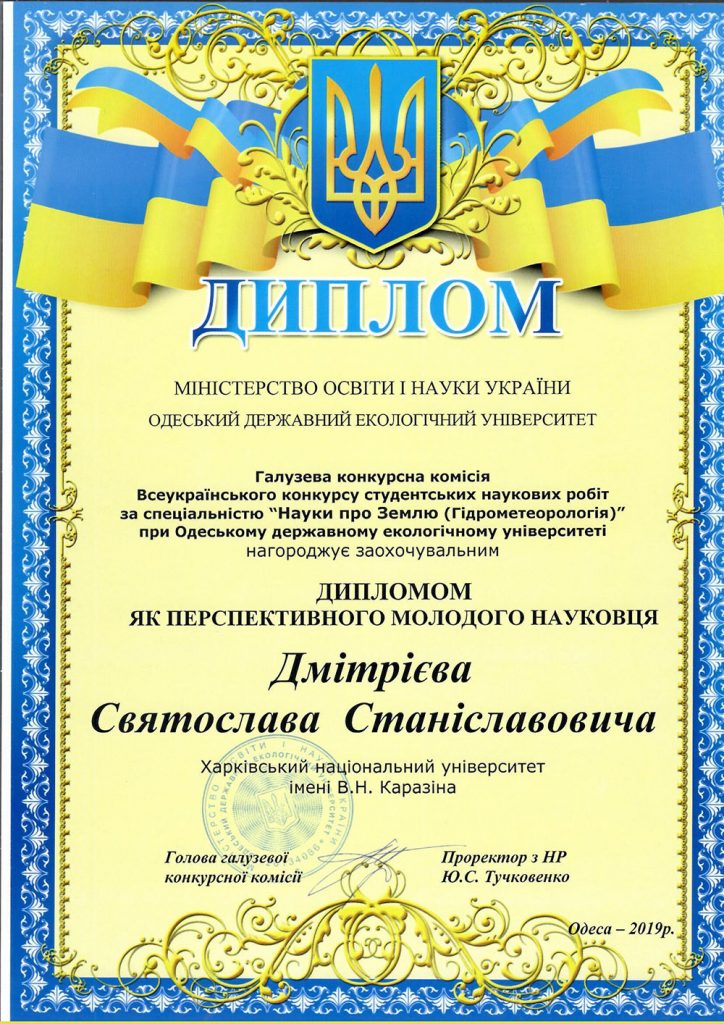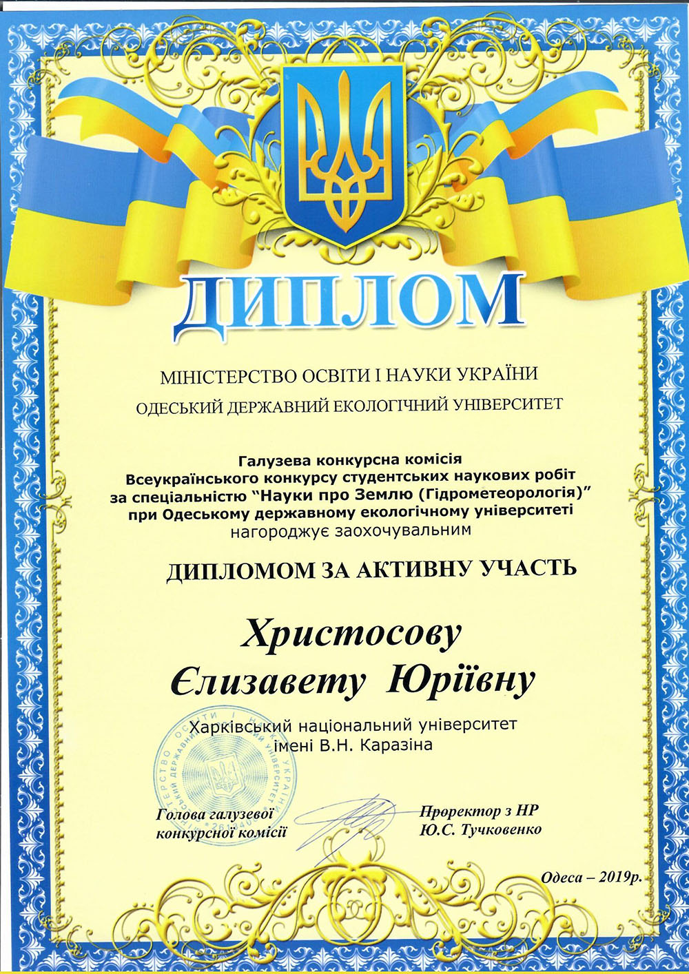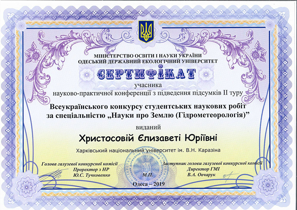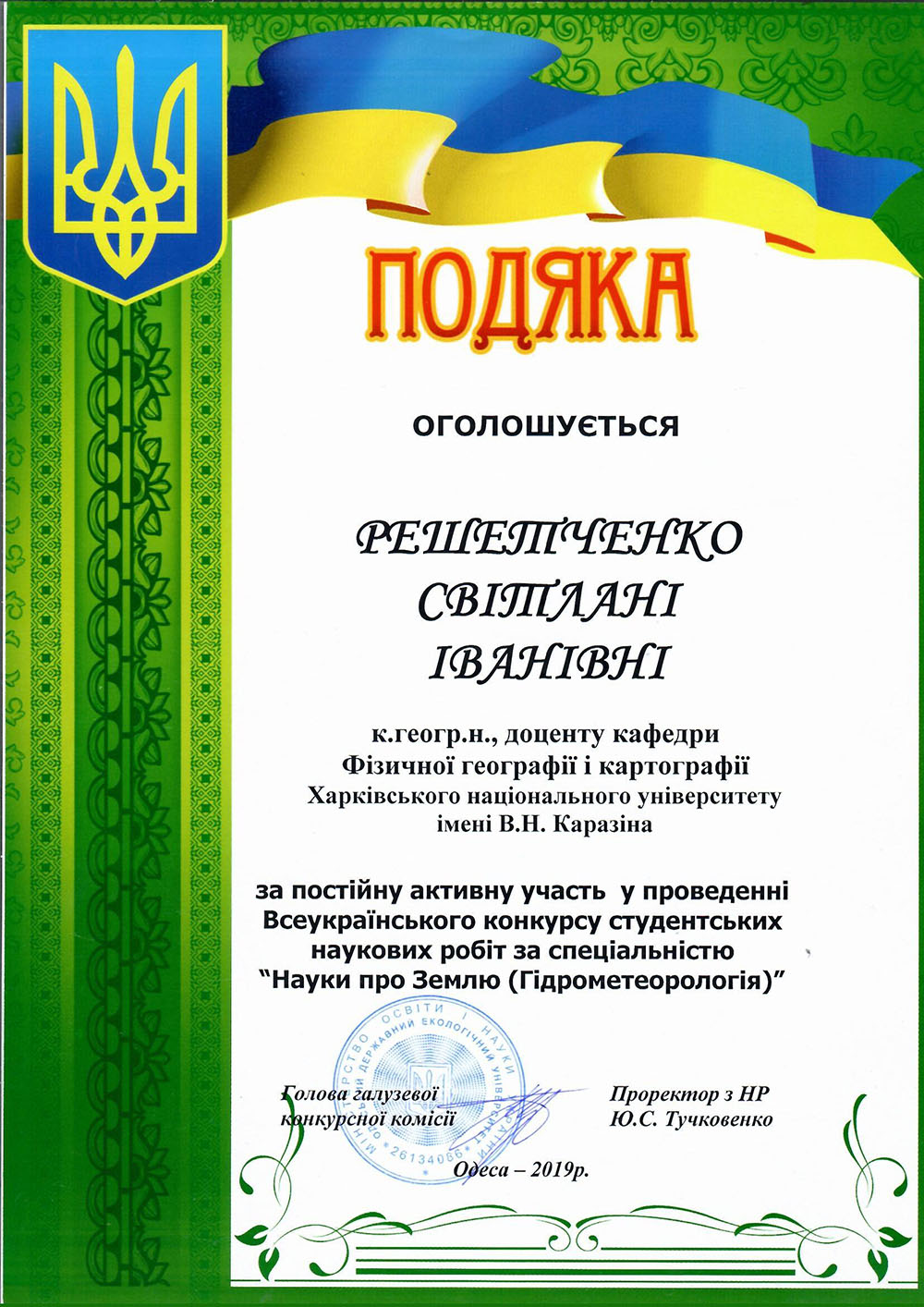 22-23 березня 2019 року студенти кафедри фізичної географії та картографії Христосова Є.Ю. (ГГ-41) та Дмитрієв С. С. (ГГ-31) прийняли участь у II турі науково-практичної конференції Всеукраїнського конкурсу студентських робіт за спеціальністю “Науки про Землю” (Гідрометеорологія) (науковий керівних – доцент Решетченко С. І.).