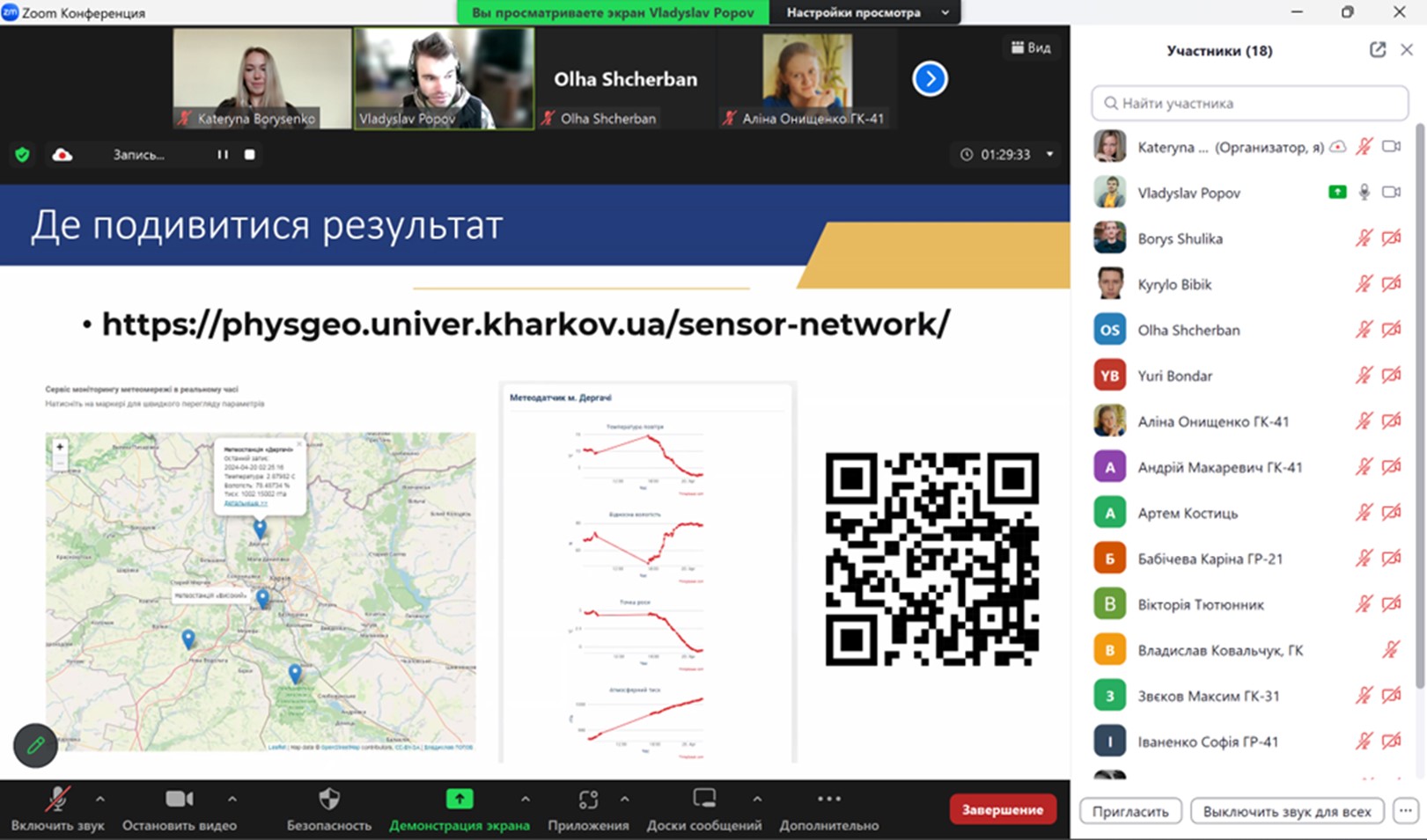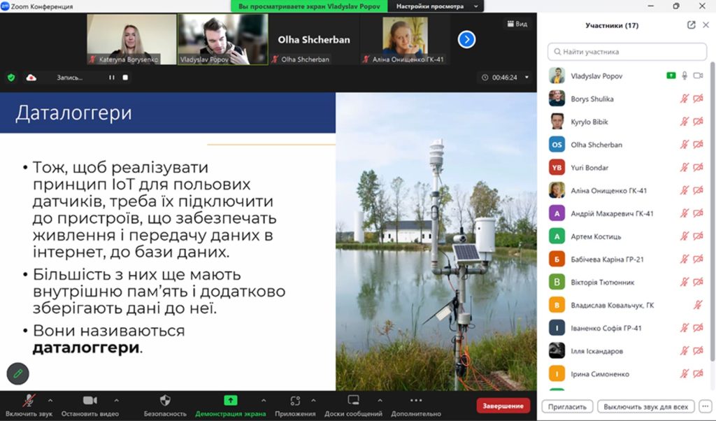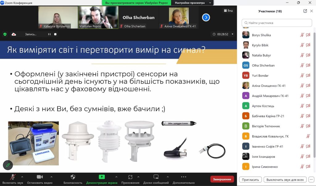 У першій частині заходу завідувач лабораторії ГІС і ДЗЗ Владислав ПОПОВ представив огляд основних принципів інтернету речей та його ролі в питаннях автоматичного збору географічної інформації. В якості наочної демонстрації робочих приладів було представлено детальну інформацію про розробку і використання власного автоматичного метеодатчика, на основі яких наразі функціонує метеомережа кафедри. До обговорення результату долучилися колеги і студенти, було додатково роз’яснено деякі суто практичні речі, не освітлені у основному докладі, зокрема і з питань подальшої комерціалізації розробок.