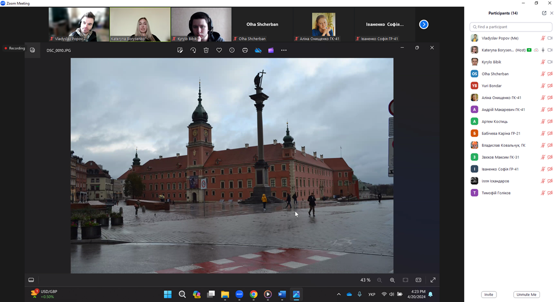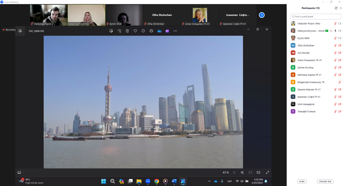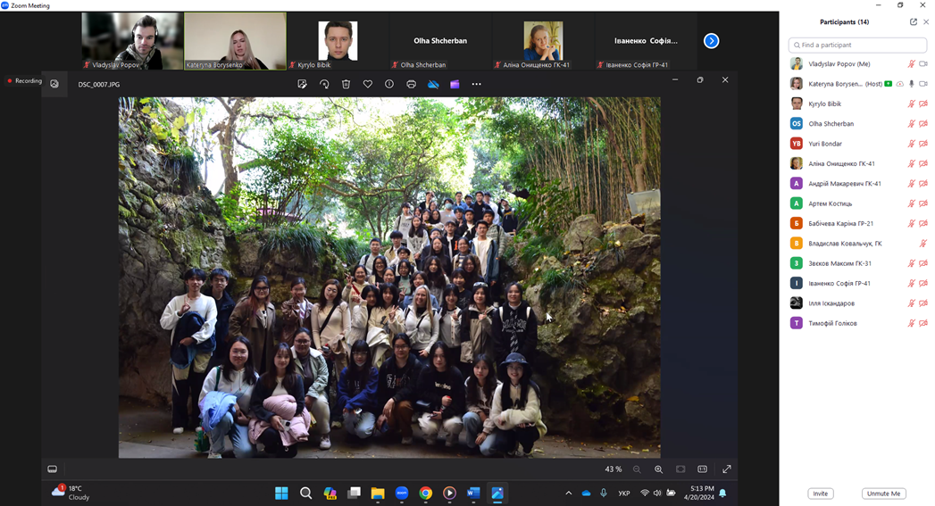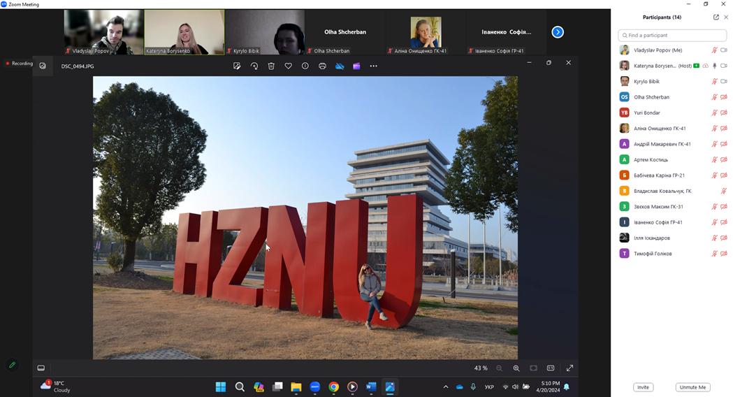 У другій частині доцент Катерина БОРИСЕНКО провела захоплюючий екскурс, побудований на власному досвіді викладання в Ханчжоуському педагогічному університеті минулого семестру. Катерина Борисівна, як і завжди, висловила унікальне бачення особливостей природи, соціуму і культури, і представила широке географічне охоплення природних та культурних пам’яток Китаю, які вона за будь-якої вільної хвилини намагалася відвідати (окрім Ханчжоу також було представлено надзвичайні пейзажі островів Чжоушань та Путошань, а також неймовірні міські панорами Шанхаю та Сучжоу). Увагу було приділено і самому досвіду викладання, організації навчання як такого і власному досвіду організації польової роботи. Окрім того, Катерина Борисівна невеличку частину своєї розповіді присвятила Польщі, шляхами якої їй також випала можливість пройти нещодавно.