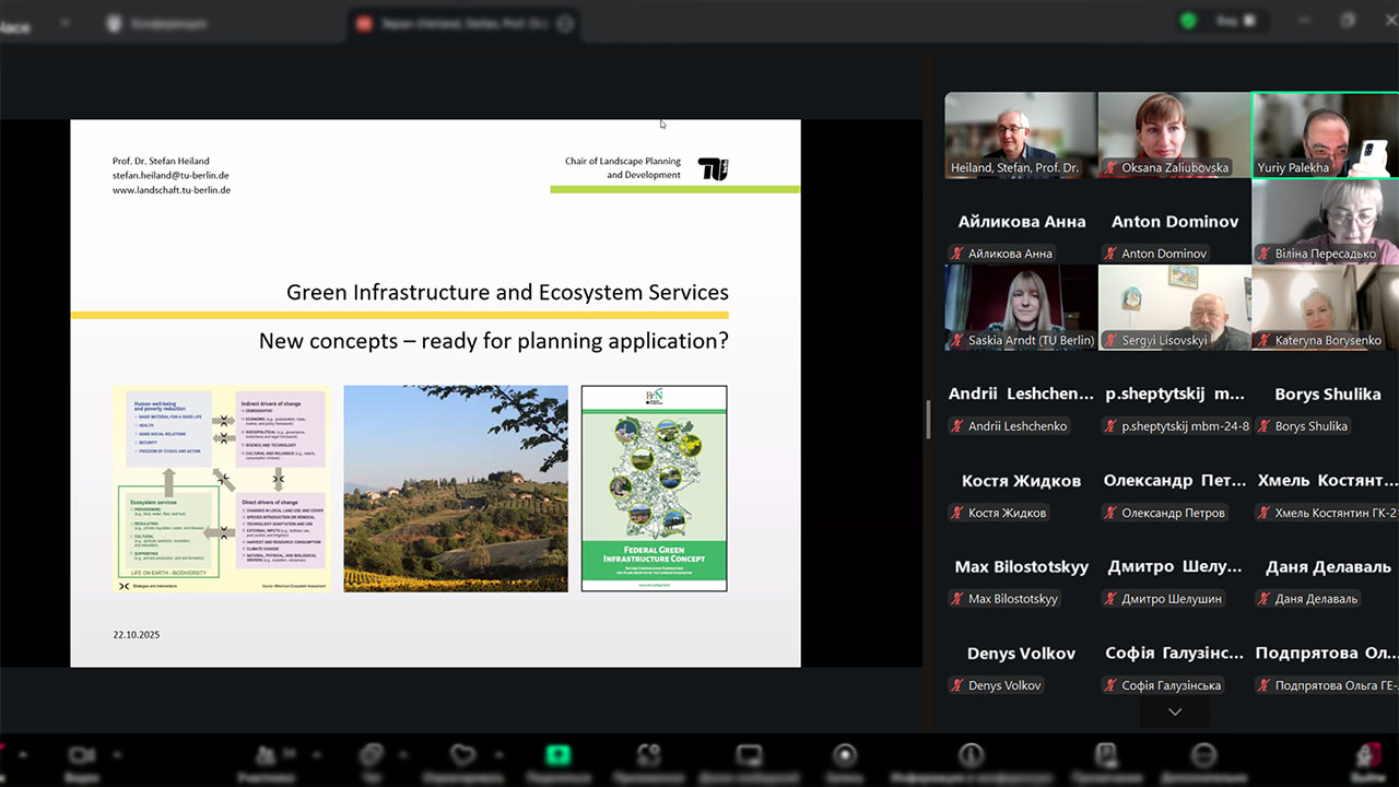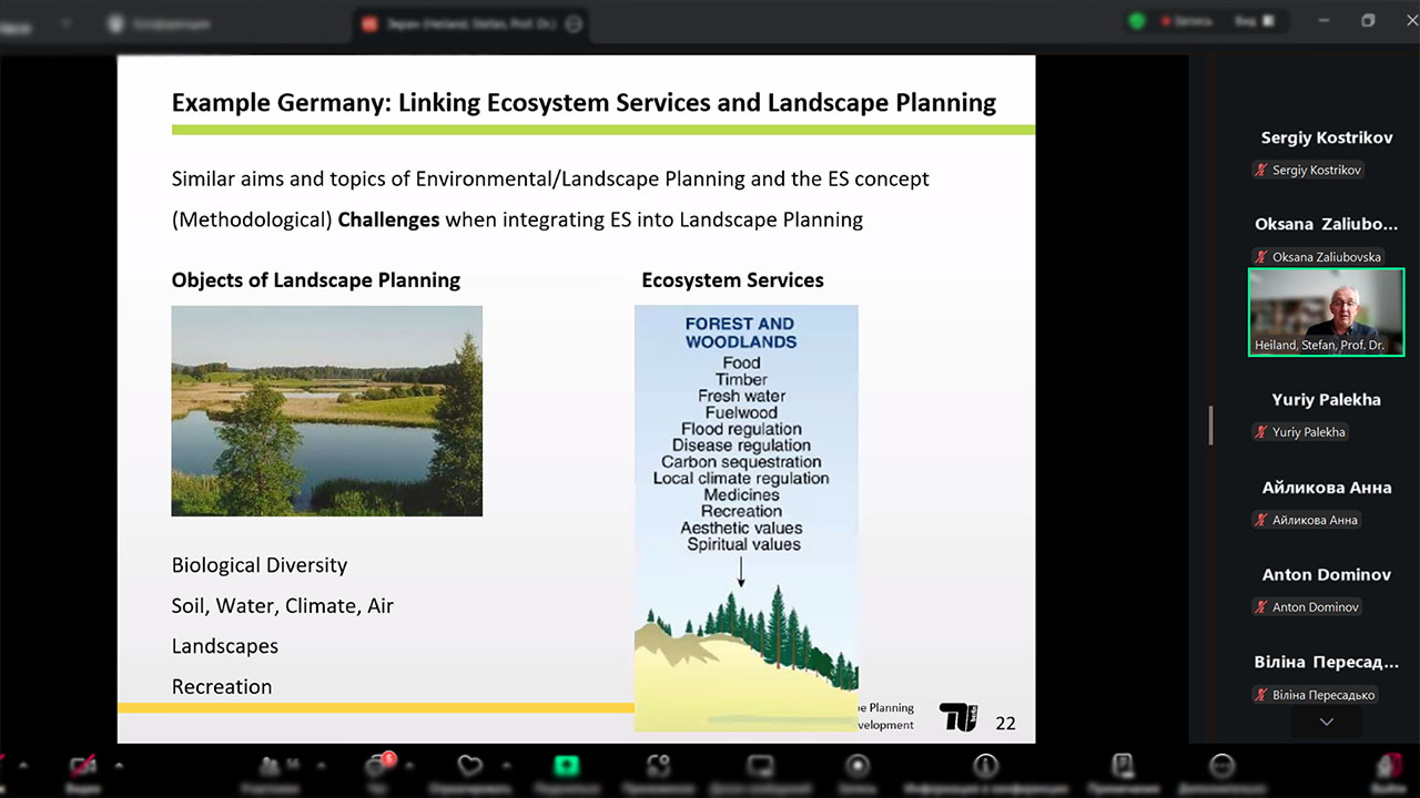 Лекція була присвячена загальним питанням концепцій екосистемних послуг та зеленої інфраструктури як концепцій, які протягом останніх двох десятиліть викликають значний інтерес, обговорюються та застосовуються на глобальному, європейському та національному рівнях.