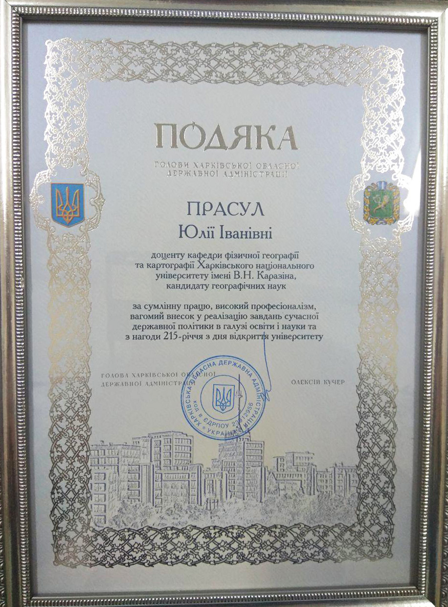 Завідувач кафедри, доцент Юлія Іванівна Прасул отримала Подяку голови Харківської обласної адміністрації О. В. Кучера, якою відзначено сумлінну працю, високий професіоналізм та вагомий внесок у реалізацію завдань сучасної політики в галузі освіти та науки України. Подяку було приурочено до нагоди 215-ї річниці з дня відкриття Університету.