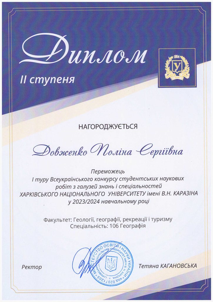 3. ДОВЖЕНКО Поліну (ОП «Картографія, ГІС і ДЗЗ» студентка 1 курсу магістратури) – диплом ІІ ступеня (спеціальність 106 Географія) науковий керівник доц. к. пед. н. Борисенко К.Б.;