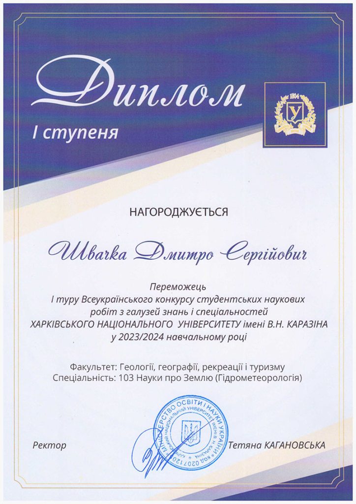 Вітаємо студентів кафедри фізичної географії та картографії, а також їх наукових керівників, з перемогою на Всеукраїнському конкурсі студентських наукових робіт з галузей знань і спеціальностей Харківського національного університету імені В.Н. Каразіна у 2023/2024 навчальному році: