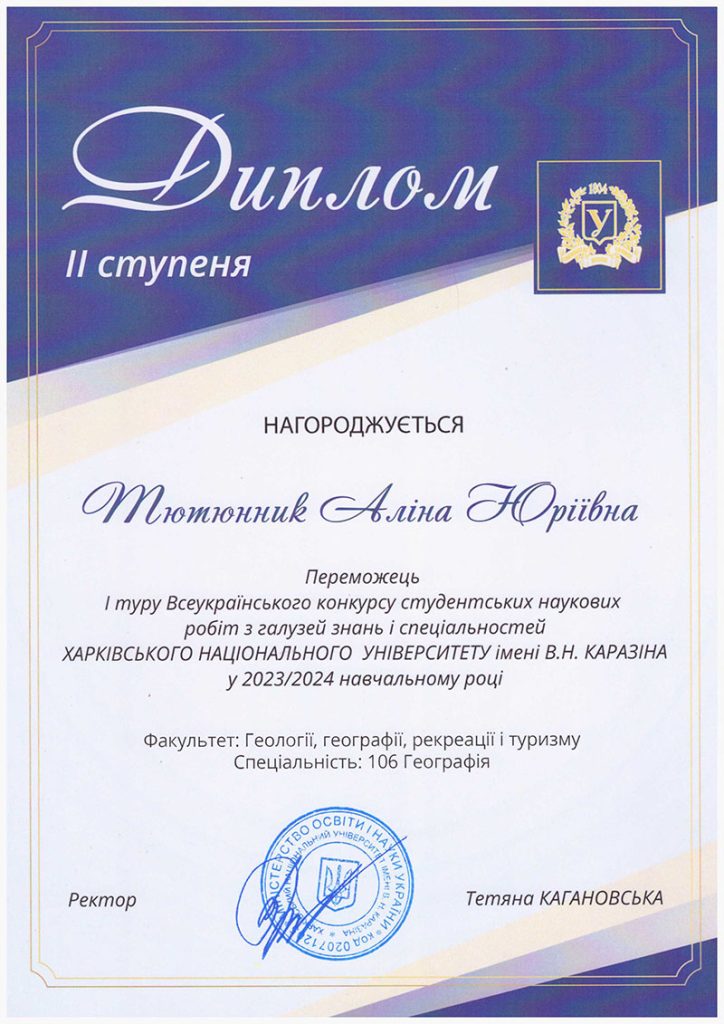 2. ТЮТЮННИК Аліну (ОП «Географія рекреації та туризму» студентка 1 курсу магістратури), – диплом І ступеня (спеціальність 106 Географія) науковий керівник – доц. к. геогр. н., ПРАСУЛ Ю. І.;