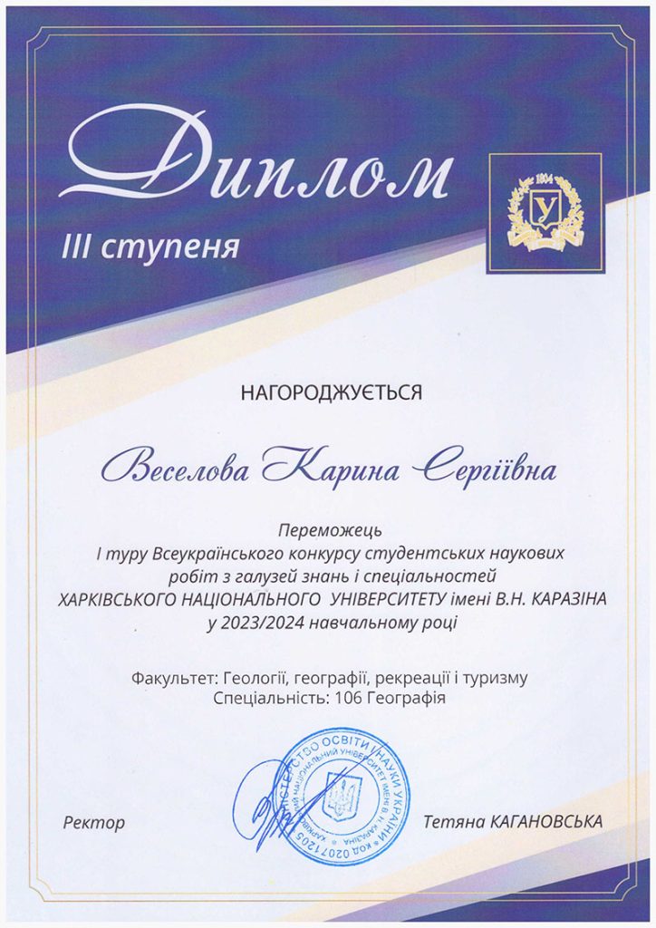 4. ВЕСЕЛОВУ Карину – (ОП «Картографія, геоінформатика і кадастр» 4 курс бакалаврату) – диплом ІІІ ступеня (спеціальність 106 Географія) науковий керівник доц. к. пед. н. Борисенко К.Б.;