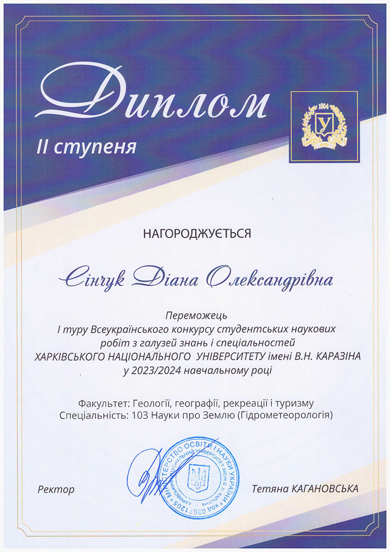 6. СІНЧУК Діану (ОП «Фізична географія, моніторинг і кадастр природних ресурсів, 4 курс бакалаврату») – диплом ІІ ступеня (спеціальність Науки про Землю (Гідрометеорологія)) науковий керівник доц. к. пед. н. Борисенко К.Б.;