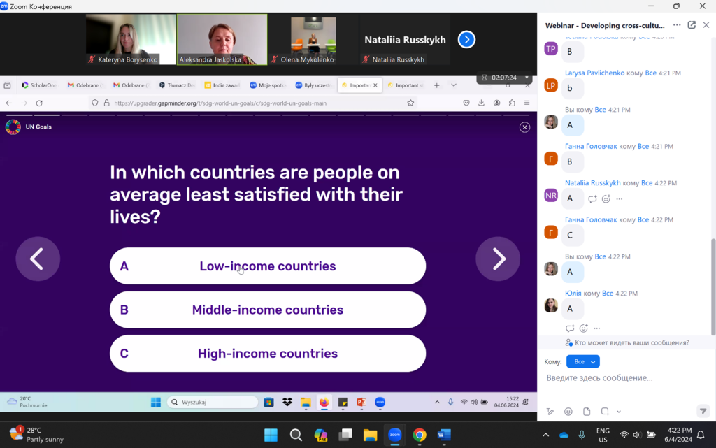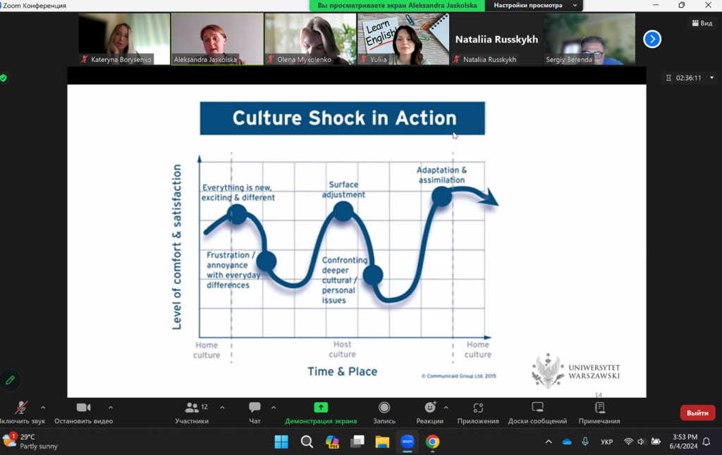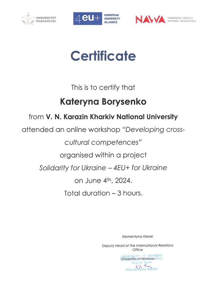 Доцент кафедри к. пед. н. Катерина БОРИСЕНКО взяла участь в англомовному онлайн вебінарі «Developing cross-cultural competences», «Розвиток крос-культурних компетенцій» організованого іноземними партнерами Каразінського університету з Варшавського університету в межах проєкту «Solidarity with Ukraine – 4EU+ for Ukraine II» який фінансується Національним агентством академічних обмінів Республіки Польща (NAWA)., який відбувся 04 червня 2024 року. Лектор: д-р Александра Яшкольська, факультет політології та міжнародних досліджень, Варшавський університет.