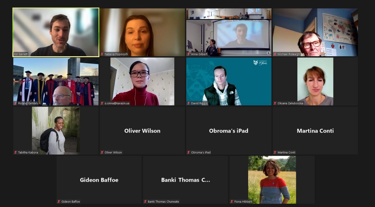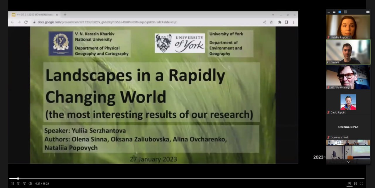 У пятницю, 27 січня 2023 року, відбувся черговий спільний науковий семінар викладачів кафедри фізичної географії та картографії Каразінського університету та викладачів кафедри навколишнього середовища та географії Університету Йорку (Велика Британія). Цей захід став другим у низці запланованих наукових семінарів, що спрямовані на обмін досвідом та презентацію головних результатів наукової роботи обох кафедр та обговорення подальшої співпраці.