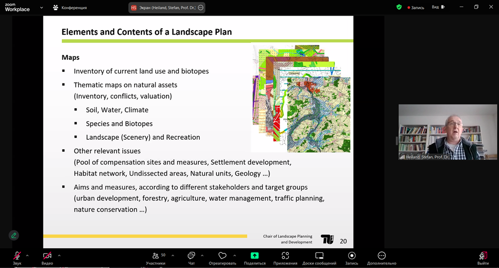Під час лекції професор Хайланд окреслив основні цілі, завдання та етапи ландшафтного планування на різних його рівнях, акцентував увагу на аспектах інтеграції ландшафтного планування в просторове планування територій.