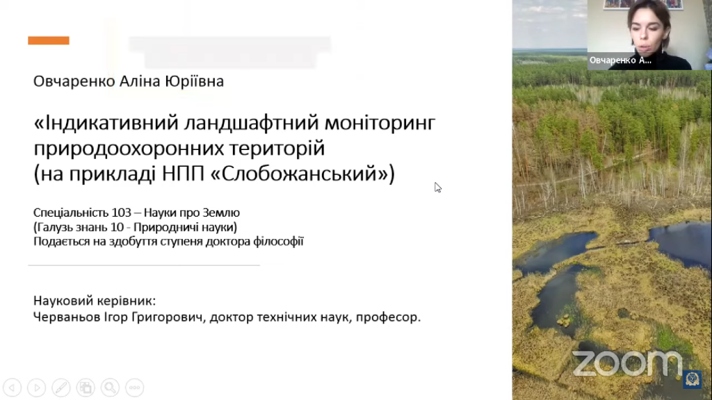 26 грудня 2023 р. відбувся захист дисертаційної роботи Овчаренко Аліни Юріївни на тему «Індикативний ландшафтний моніторинг природоохоронних територій (на прикладі НПП “Слобожанський”)».