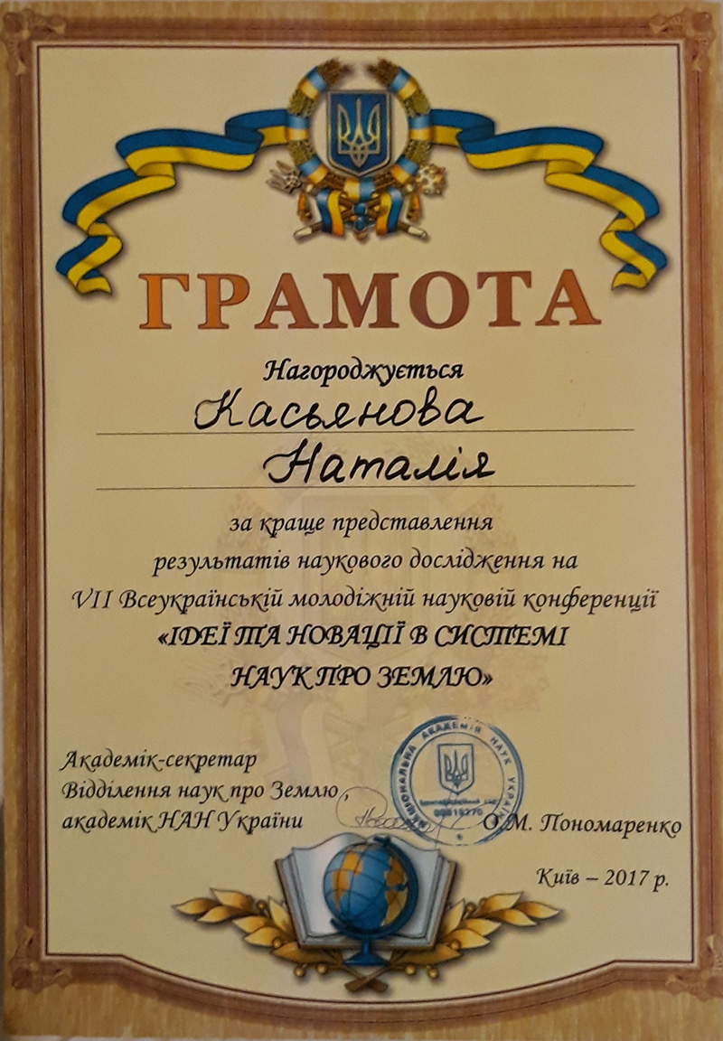 26 жовтня 2017 р. доцент О.І. Сінна та аспірантка кафедри Н.В. Касьянова взяли участь у роботі VII всеукраїнської молодіжної науково-практичної конференції «ІДЕЇ ТА НОВАЦІЇ В СИСТЕМІ НАУК ПРО ЗЕМЛЮ», що була організована інститутами відділення наук про Землю Національної академії наук України.