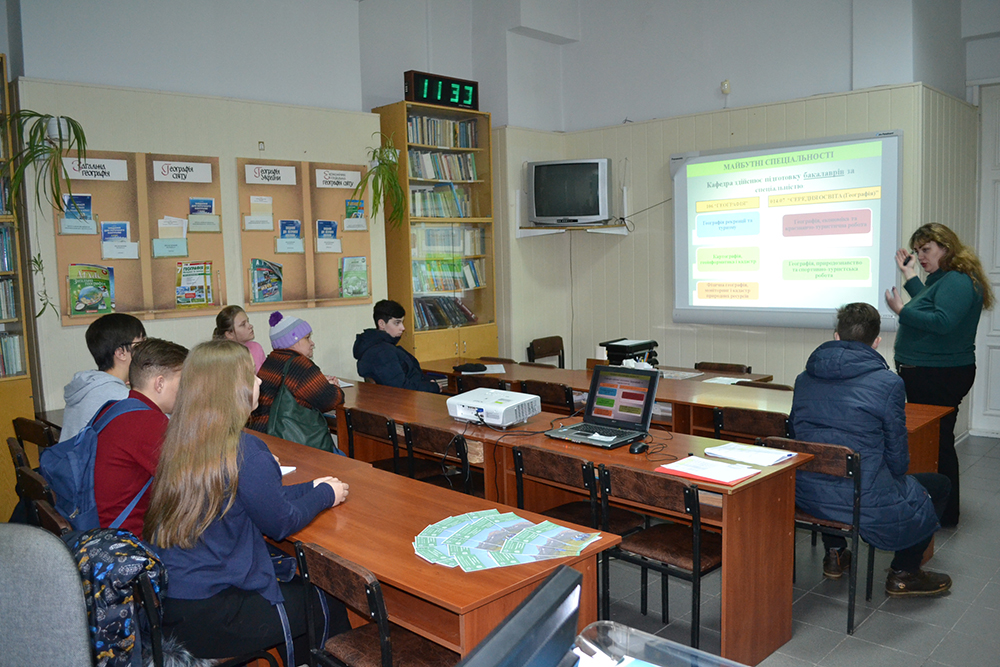 Після загального знайомства із факультетом та особливостями студенського життя на ньому, бажаючі мали можливість детальніше дізнатися про кафедри та спеціальності безпосередньо від співробітників. Старший викладач В. В. Машкіна традиційно презентувала кафедру фізичної географії, детально розповіла про майбутні спеціальності та перспективи трудовлаштування.