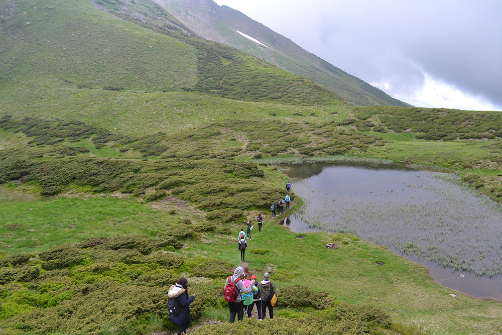 Наступного дня (5 червня) – перший вихід до субальпійського високогір’я, із вивченням характерної льодовикової форми рельєфу, кару. Значну увагу приділяється гідрологічним дослідженням, зроблено виміри на гідрологічному пості озера Івор. Студенти мали змогу спостерігати розвиток гравітаційних форм рельєфу, наприклад, зовсім свіже тіло зсуву. На зворотному шляху групу вперше потрапила під справжній карпатський дощ. На нього щастило і в наступні виходи.