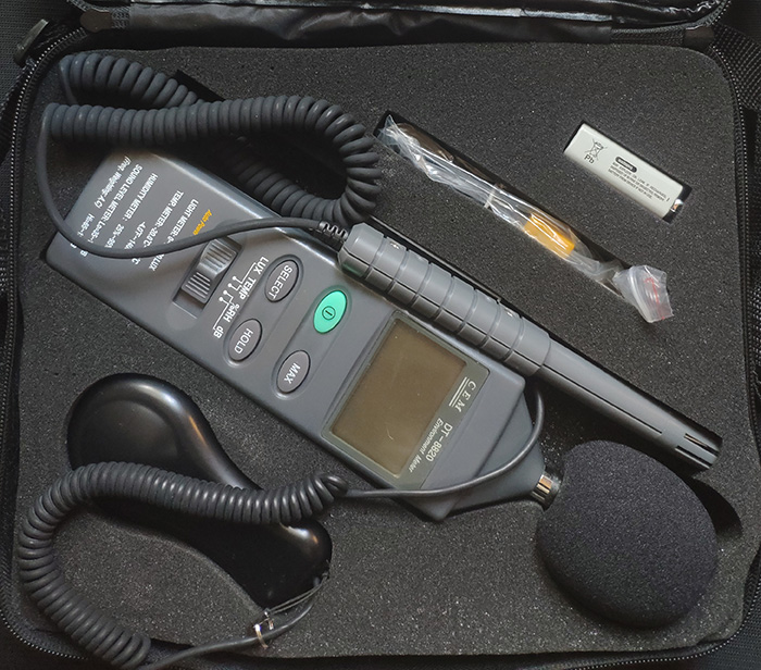 DT-8820 4 в 1 – багатофункціональний прилад для контролю параметрів навколишнього середовища. Об’єднує в собі функції шумоміра, люксметри, гігрометра і термометра. Люксметр може використовуватися для вимірювання освітленості в польових умовах. Є косинусні поправки при кутового падіння світла. Кремнієвий світлочутливий елемент, високостабільний, з довгим періодом експлуатації.
